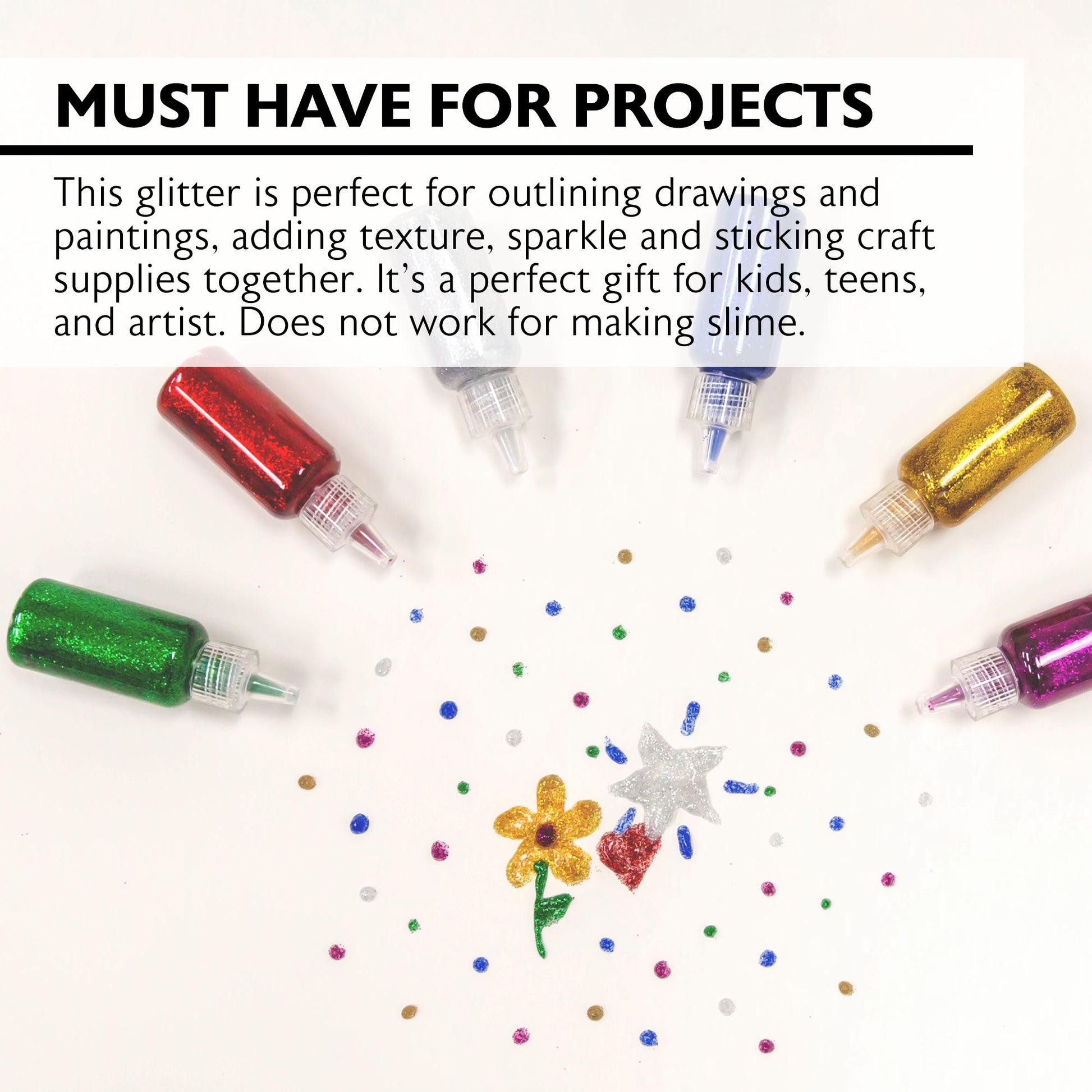 - MUST HAVE FOR PROJECTS. This glitter is perfect for outlining drawings and paintings, adding texture, sparkle and sticking craft supplies together. It's a perfect gift for kids, teens, and artist. Does not work for making slime