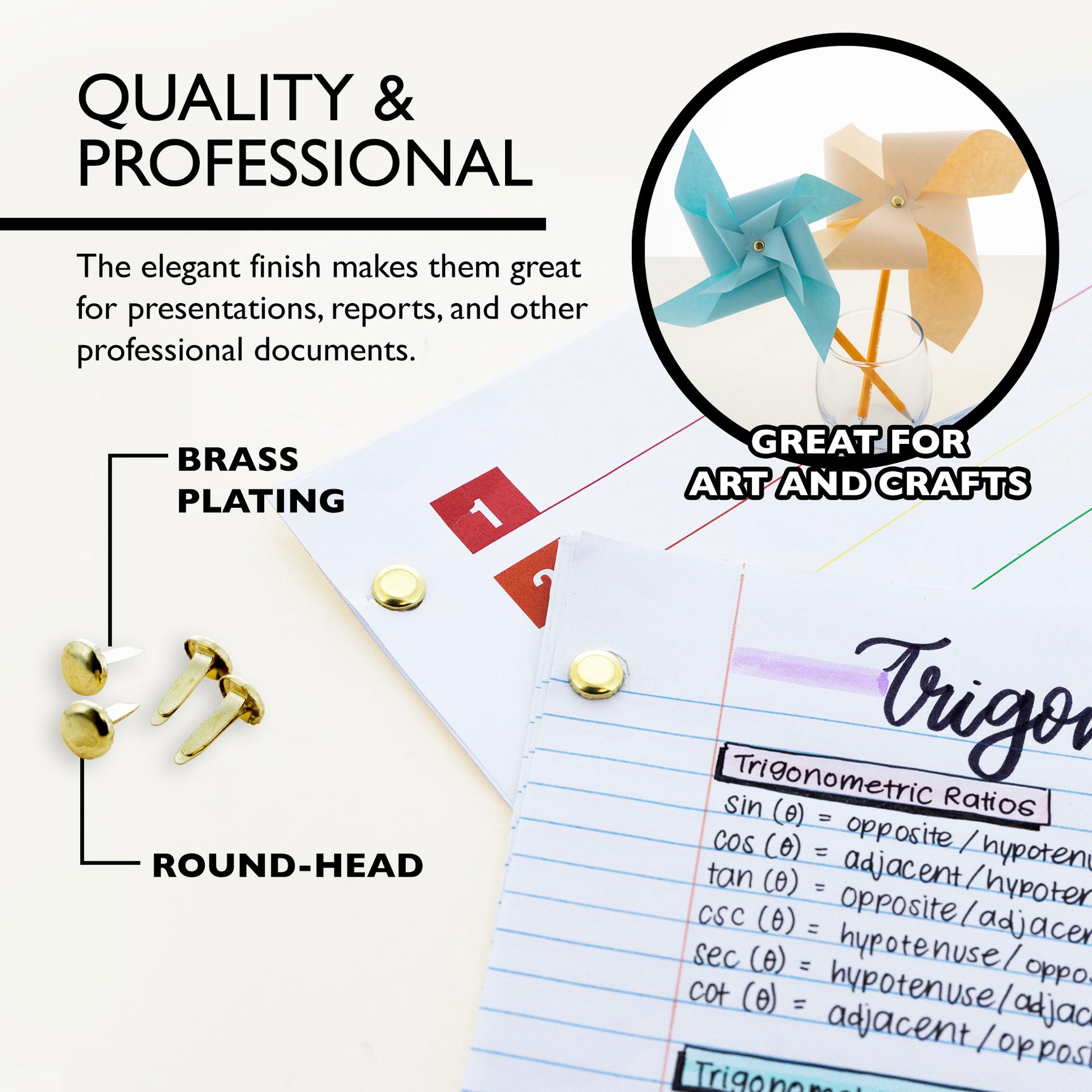 - PROFESSIONAL. Brass plating and round-head design adds a professional and polished appearance to documents. The elegant finish makes them great for presentations, reports, and other professional documents.