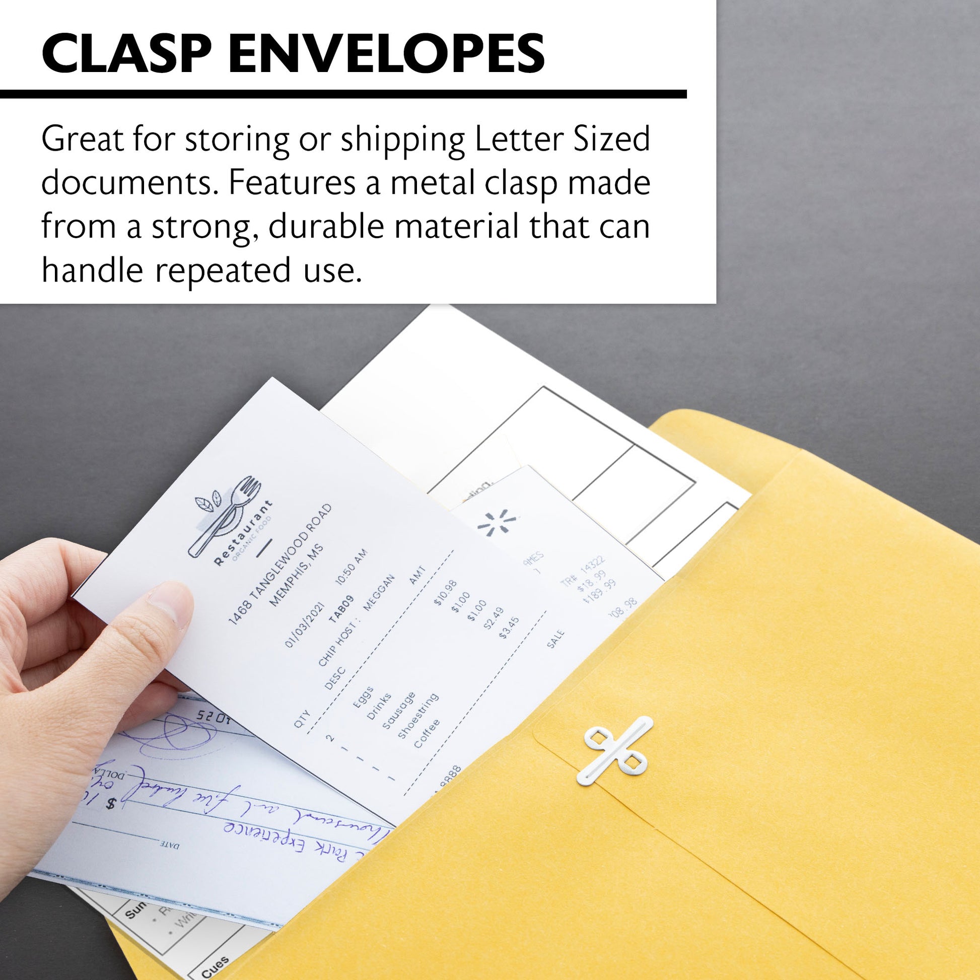 - CLASP ENVELOPES. These 10" x 13" envelopes feature a metal clasp made from a strong, durable material that can handle repeated use. Envelopes are great for storing or shipping Letter Sized documents.