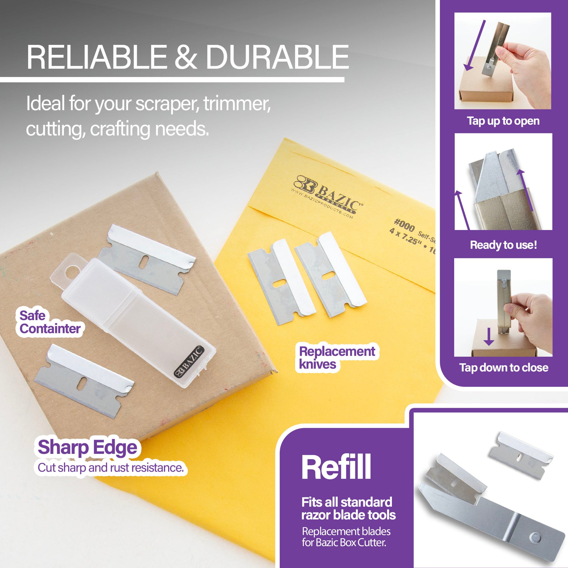 - SAFE CONTAINER. Include 8 blades & 1 storage plastic case per pack. Use in a wide range of industries: janitorial, wallpapering, foam molding, upholstery, auto tinting.