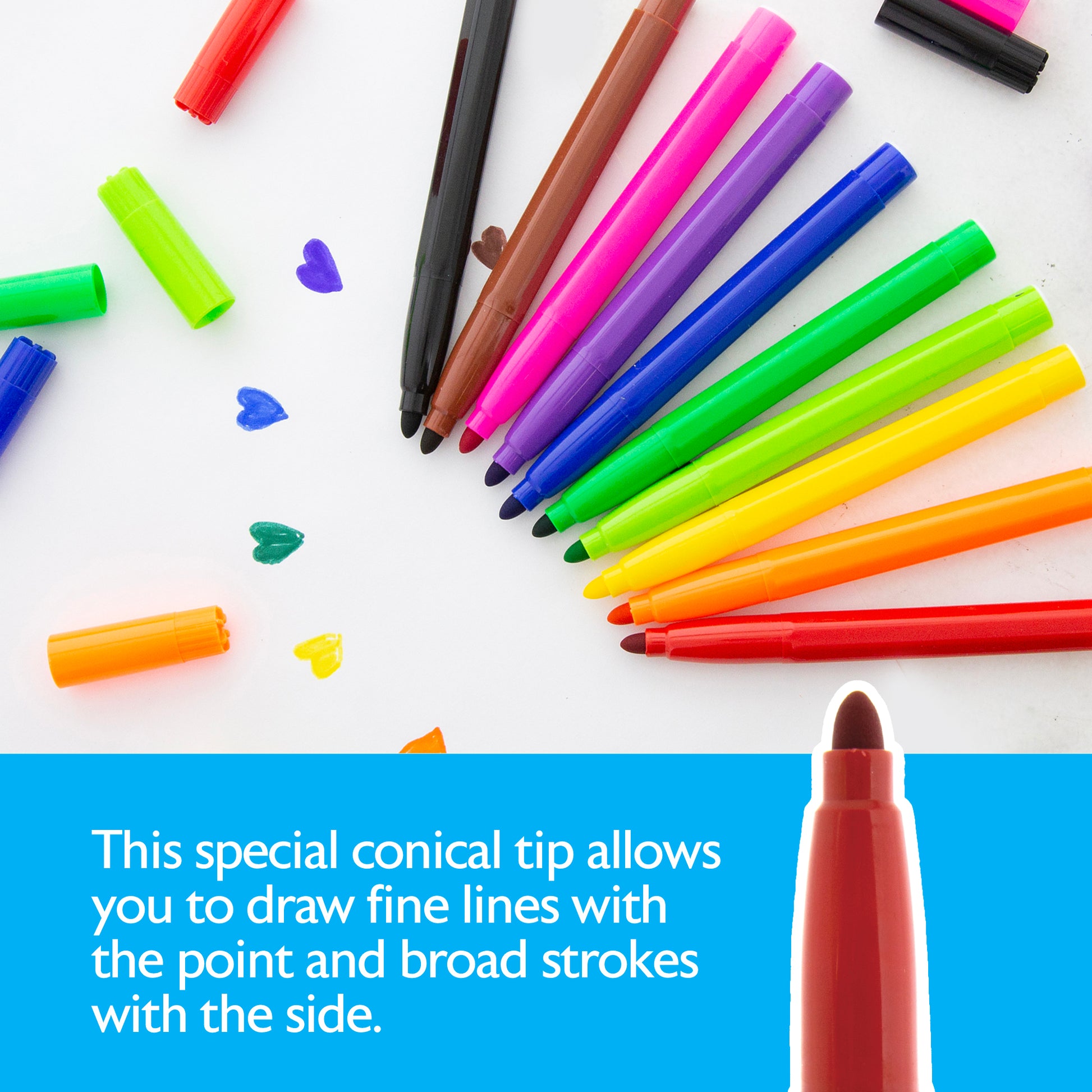- BROAD LINE WASHABLE MARKERS. Broad, durable tips are great for bold strokes of color and can sustain heavy pressure when coloring. Perfect for adding colors to posters or large artwork!