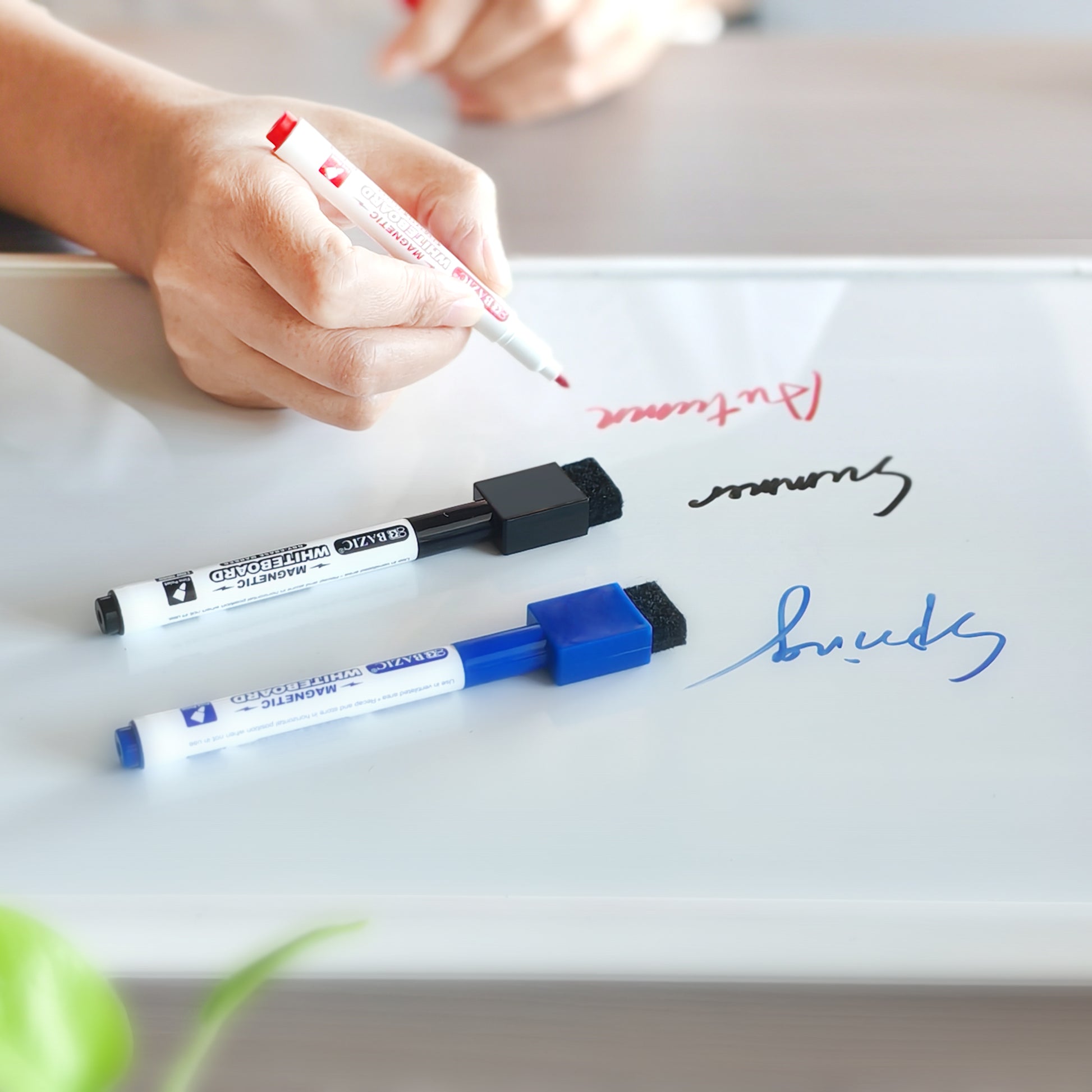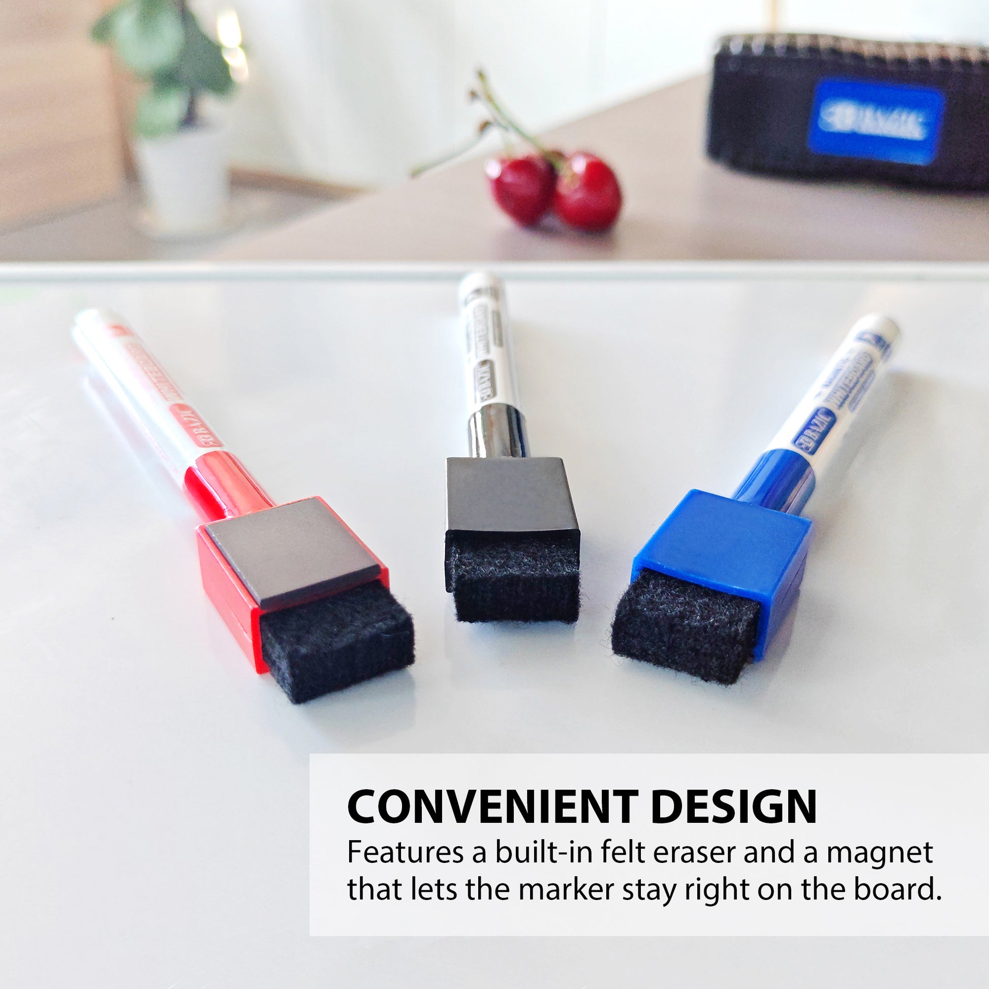 - CONVENIENT DESIGN. Feature built-in felt erasers. Magnet allows the marker to be right on the fridge. With the erase, there is no need for a separate eraser for erasing small mistakes
