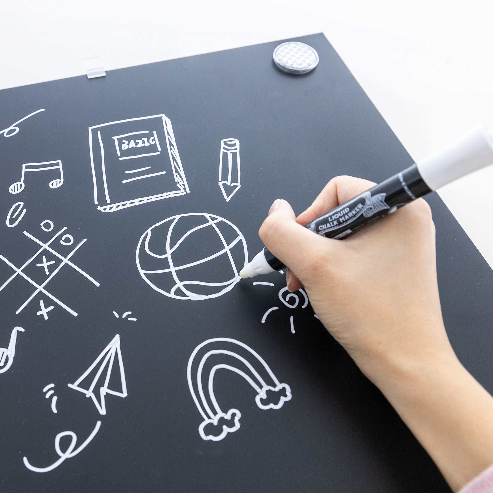 - MARKER + MAGNET. 1 magnet and 1 white color liquid chalk marker included so this chalkboard is ready to use out of the box. The marker is non-toxic, odorless, and dries quickly. When done, erase easily with a wet cloth or tissue.