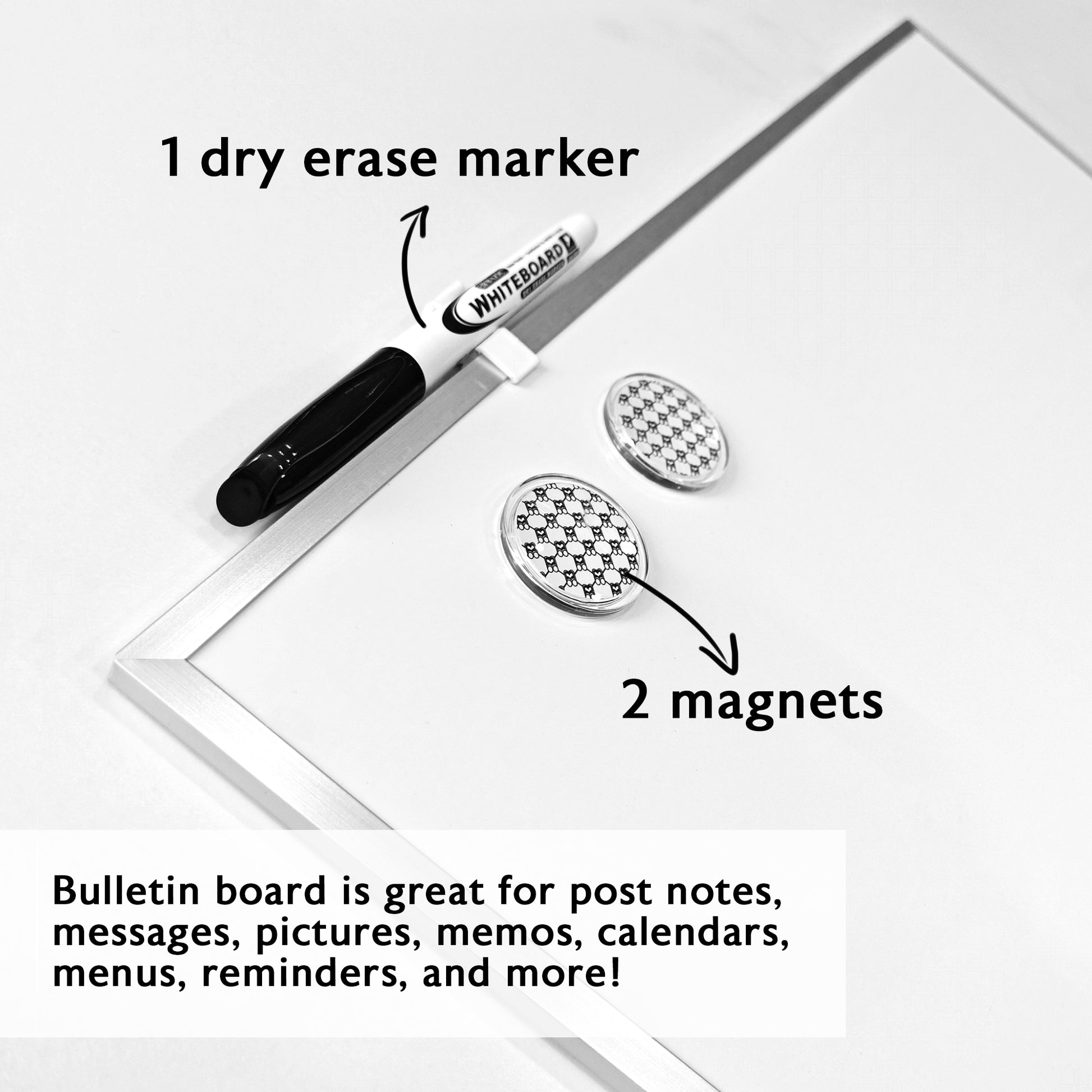 - MAGNETIC CALENDARS PAD. Include dry erase marker*1, magnet*1, screw*4. Bulletin board is great for post notes, messages, pictures, memos, calendars, menus, reminders, and more!