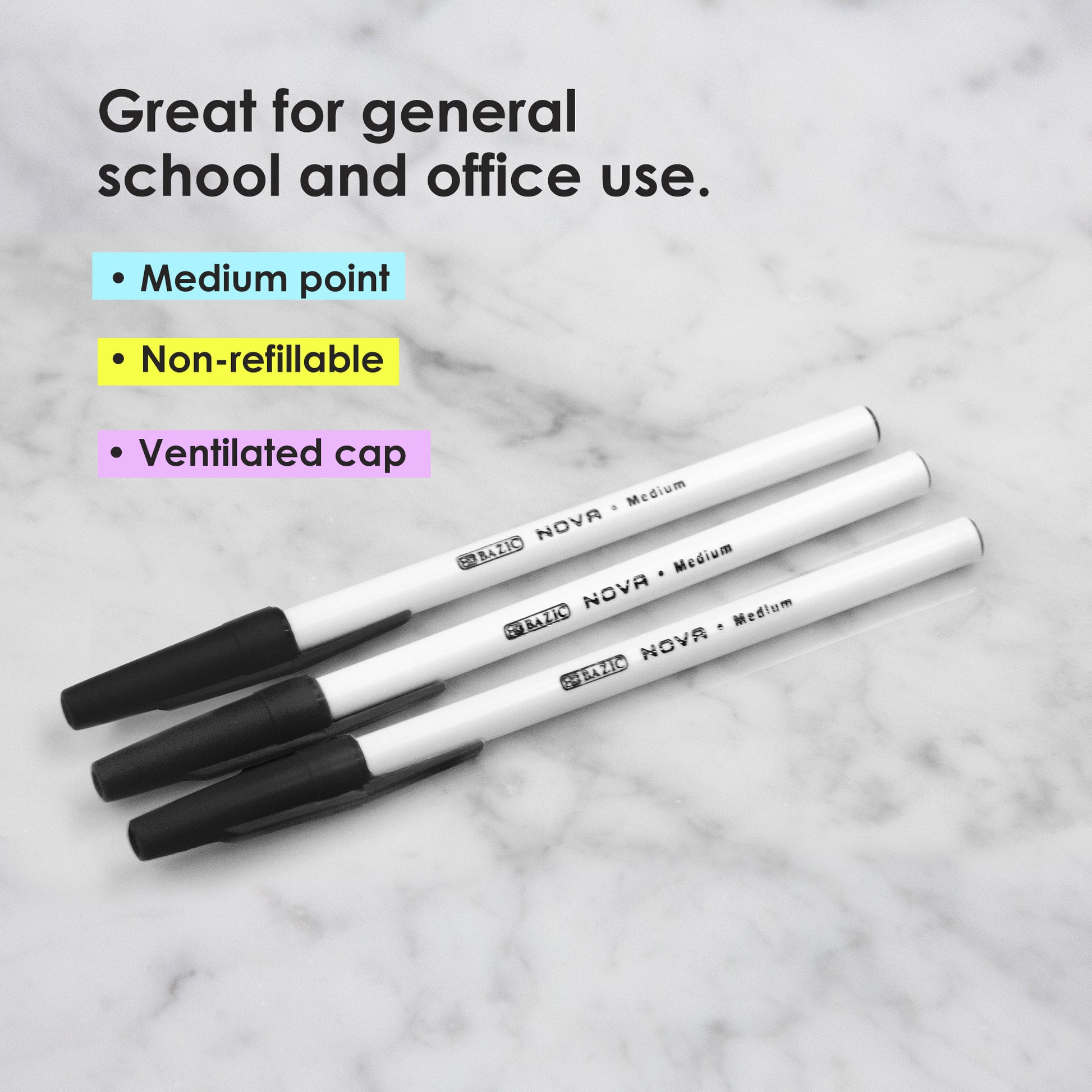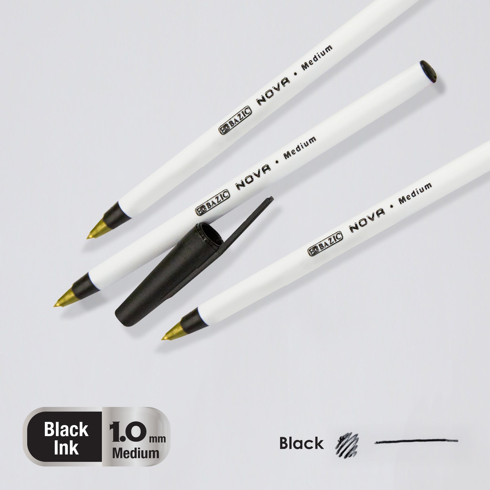 - NOVA BLACK COLOR STICK PEN. Each pack includes 12-Nova Black Stick Pens. The medium ball point spreads ink evenly as you write, offering dependable performance for everyday use.
