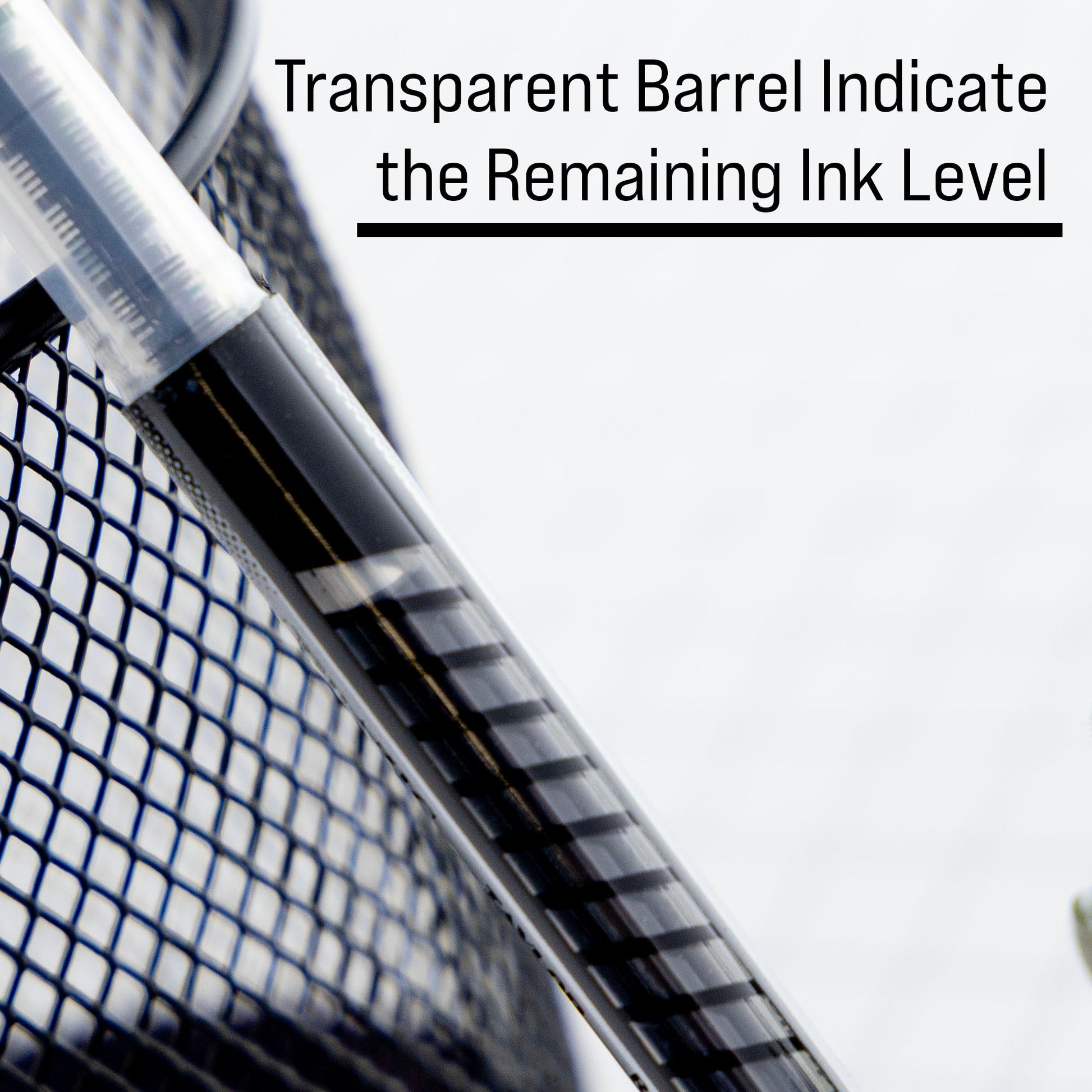 - DESIGN. Transparent barrel provides a glimpse of the ink level, making sure you never use an empty pen. Removable cap prevents unwanted marks and protects the writing tip from drying or leaking.