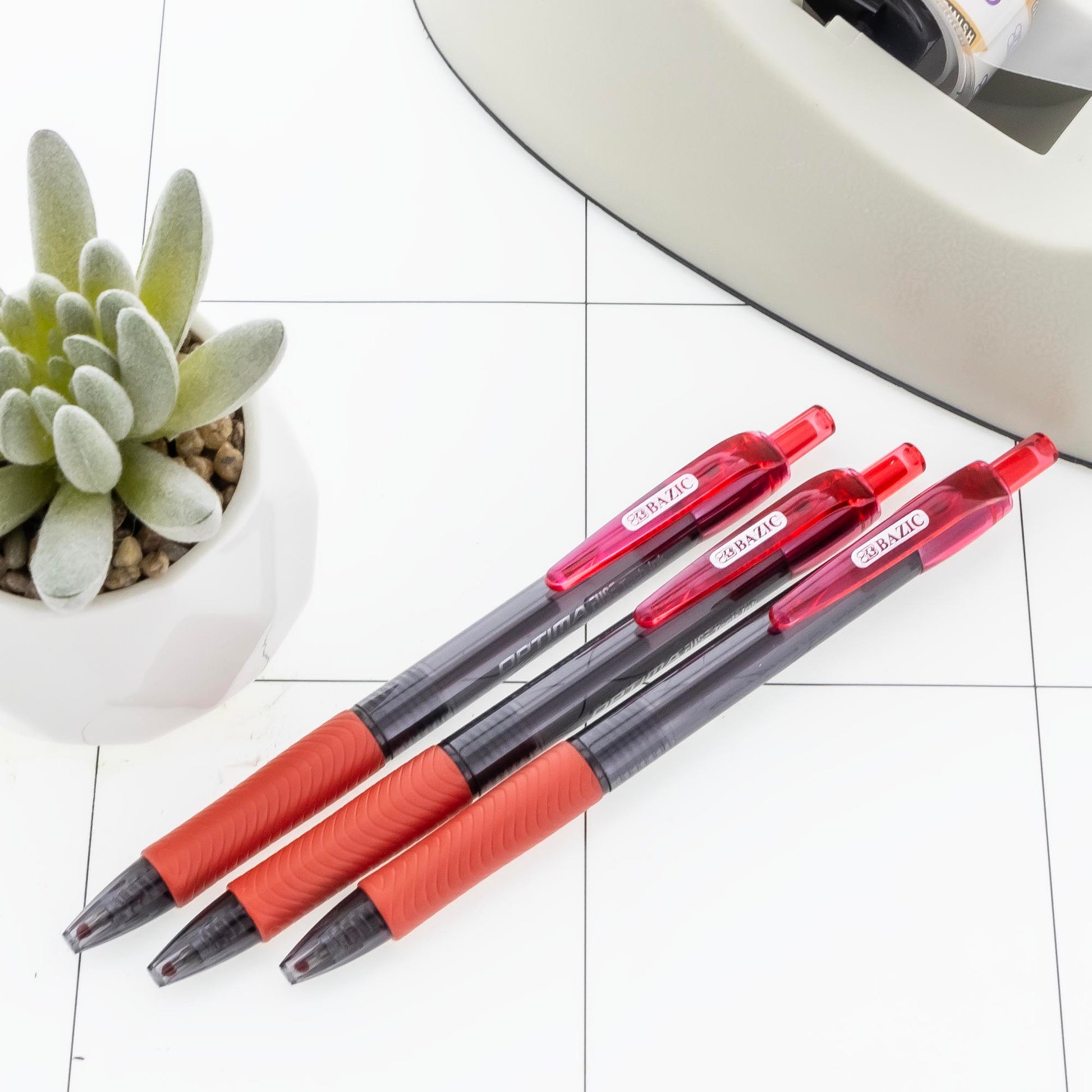 - OPTIMA RED RETRACTABLE OIL-GEL PENS. Each pack includes 3-Red Retractable Pens. The medium point spreads ink evenly as you write, offering dependable performance for everyday use.