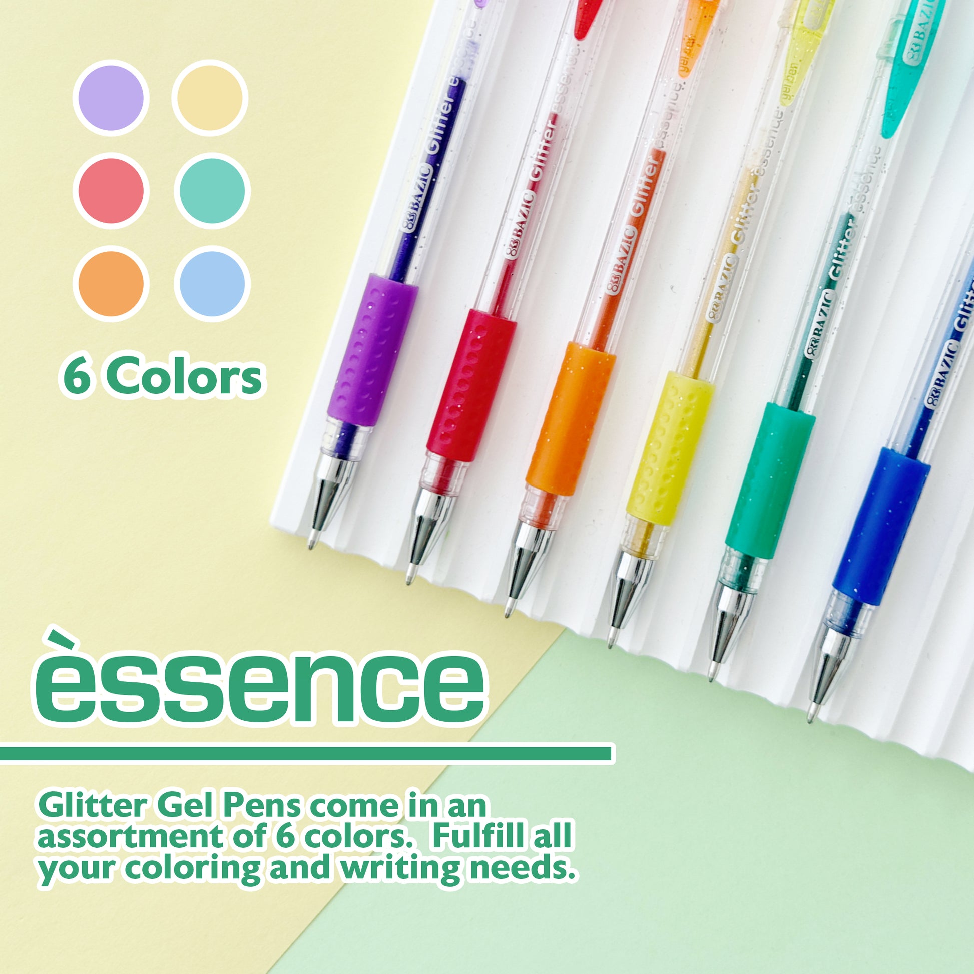 - ESSENCE GLITTER GEL PENS. Glitter Gel Pens come in an assortment of 6 colors; Actual Colors May Vary! Fulfill all your coloring and writing needs! They're great for taking the dullness out of classroom notes.