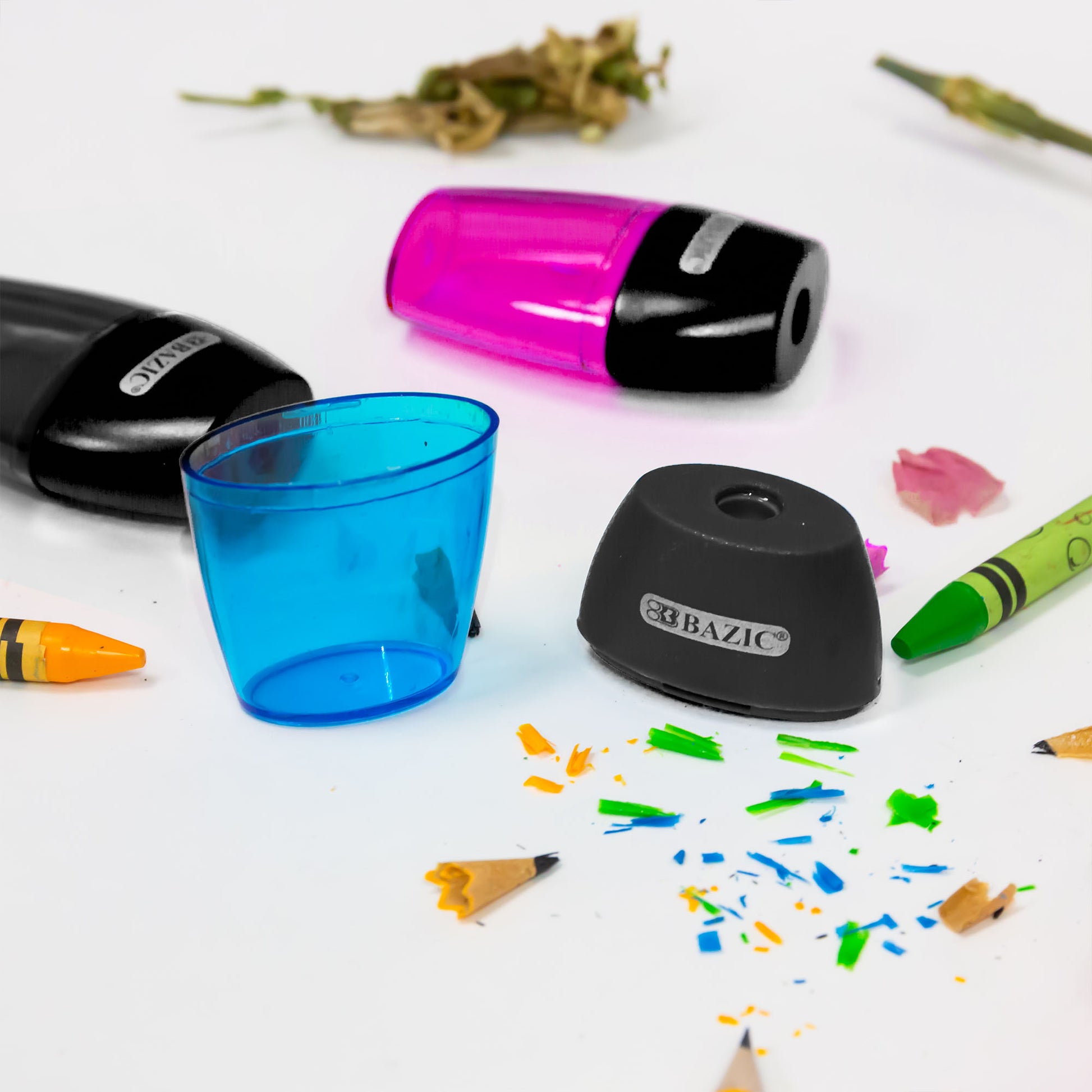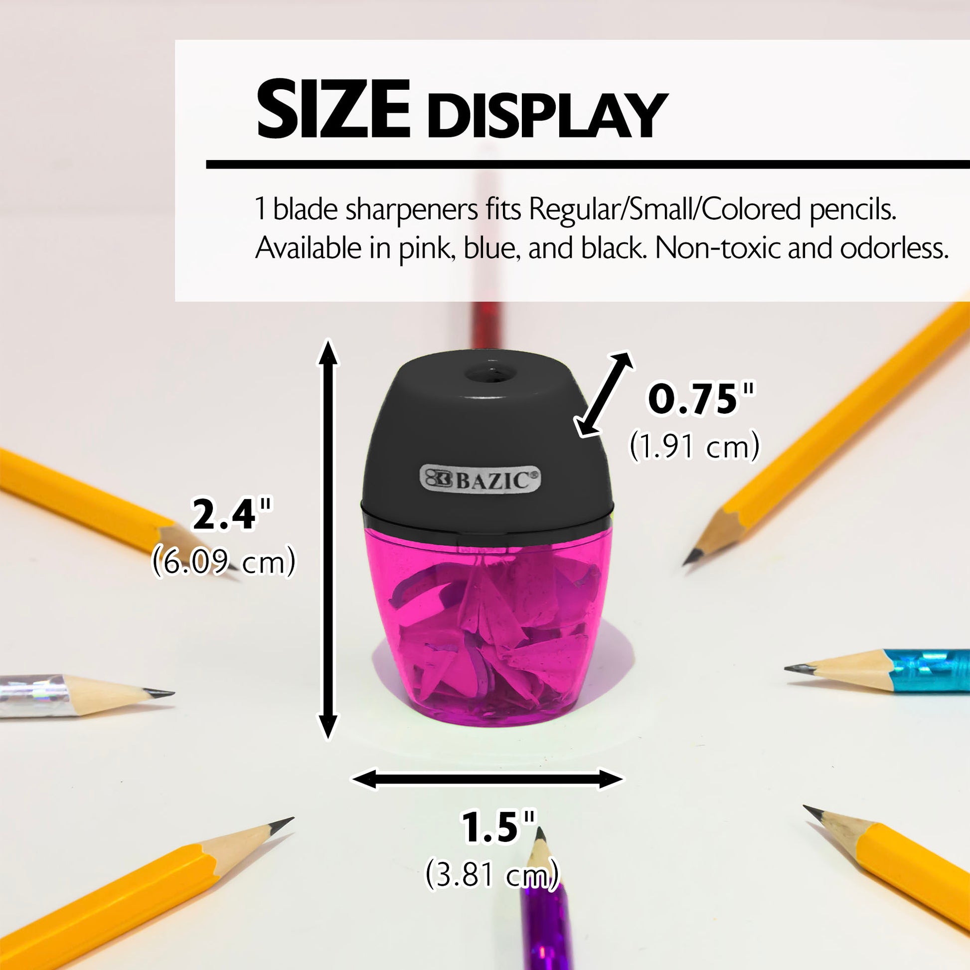- SINGLE HOLE SHARPENING. Measure 2.4" x 1.5" x 0.75". 1 blade sharpeners fits Regular/Small/Colored pencils. Available color: pink, blue and, black. Non-toxic and odorless.