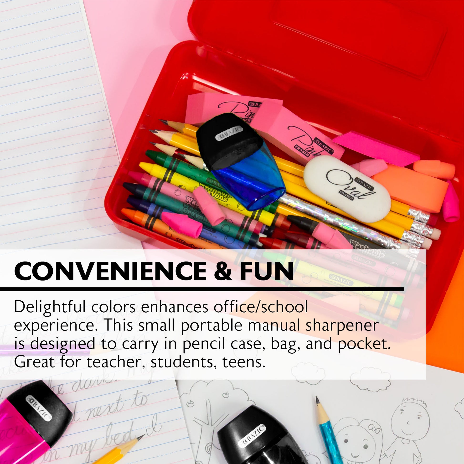 - CONVENIENCE & FUN. Delightful colors enhances office/school experience. This small portable manual sharpener is designed to carry in pencil case, bag, and pocket. Great for teacher, students, teens.