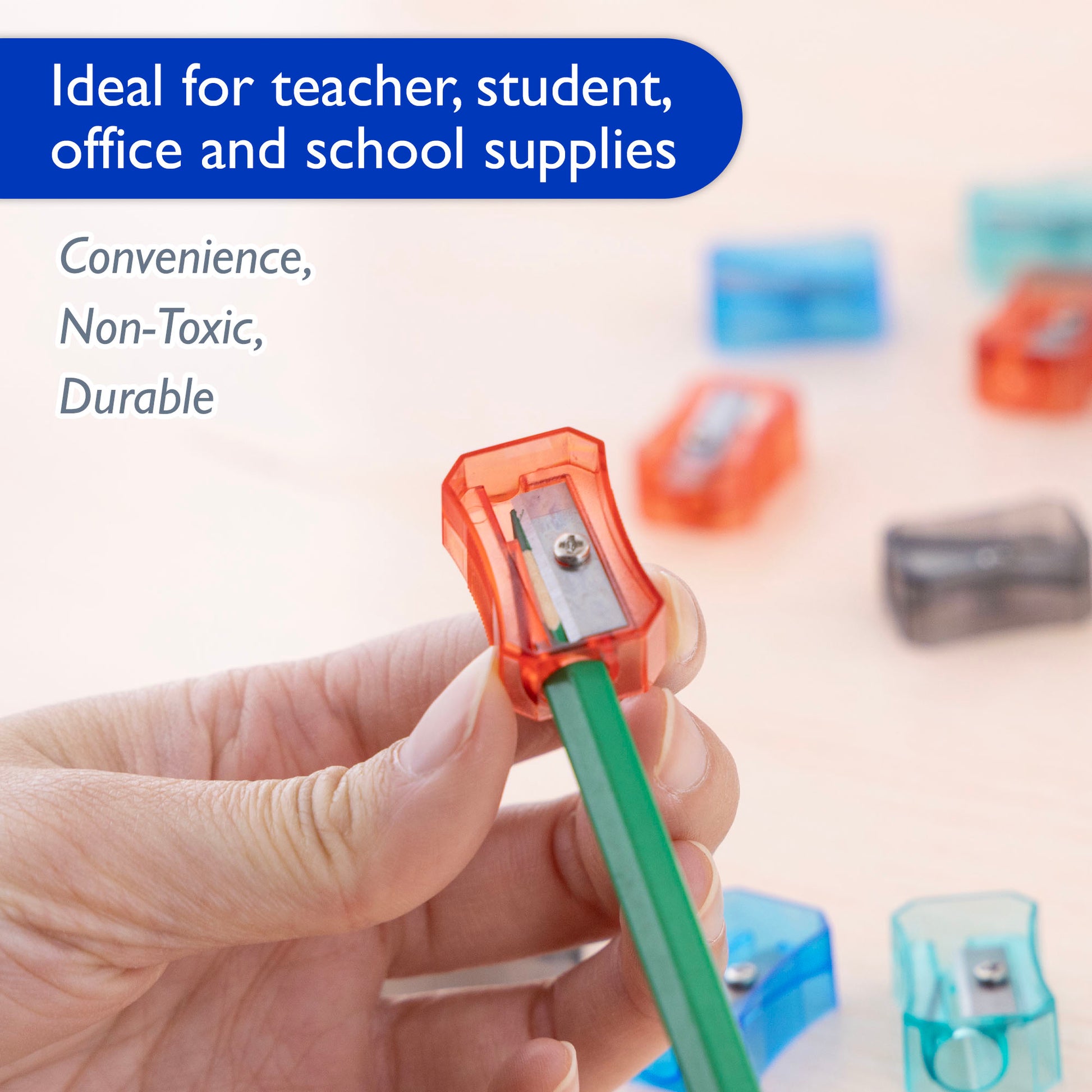- SINGLE HOLE SHARPENING. Measure 1" x 0.7" x 0.5". 1 blade sharpeners accommodates Regular/Small/Colored pencils. Available color: blue, red, green, black.