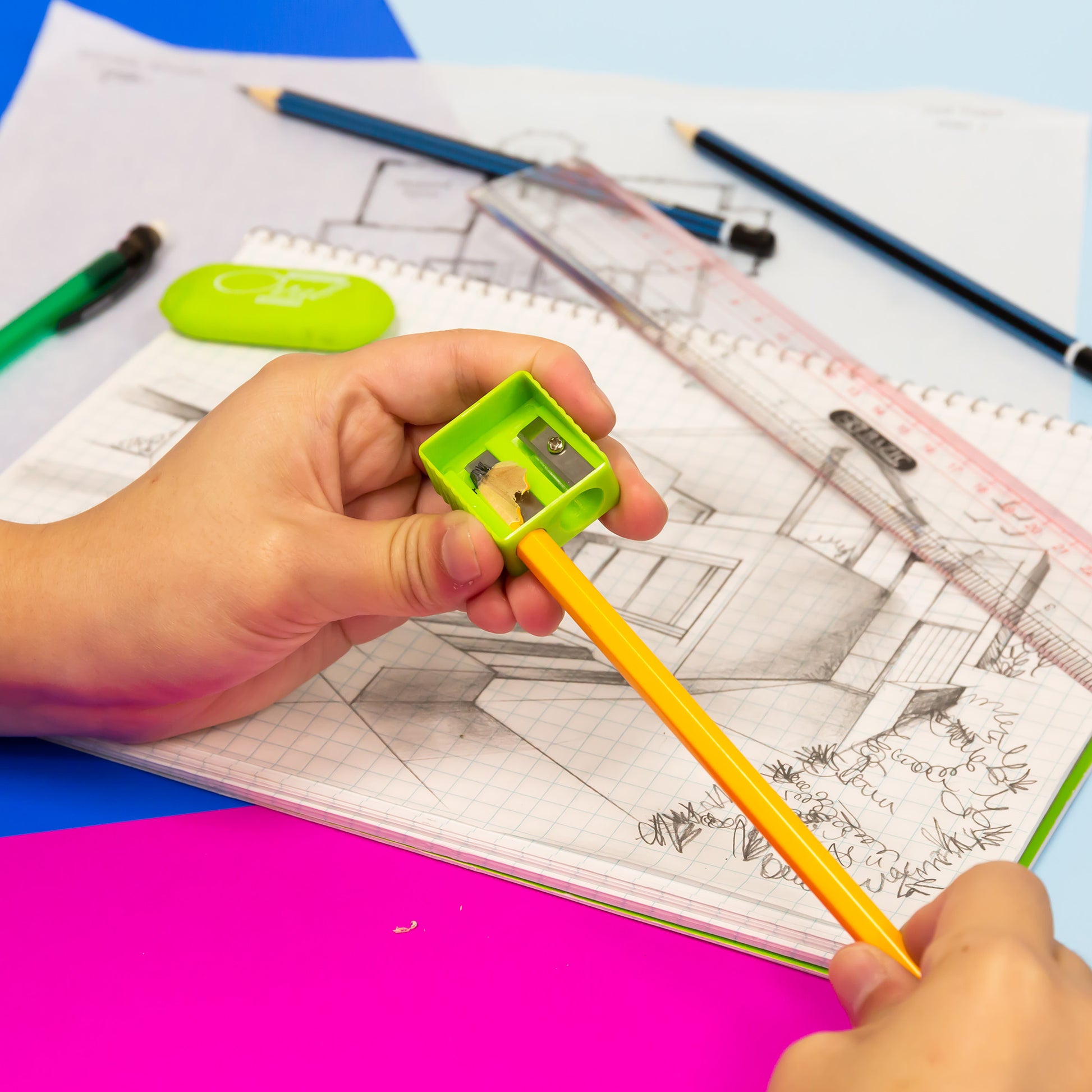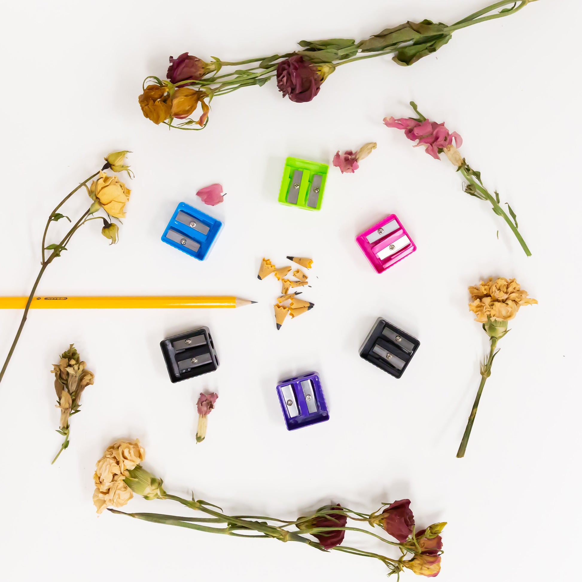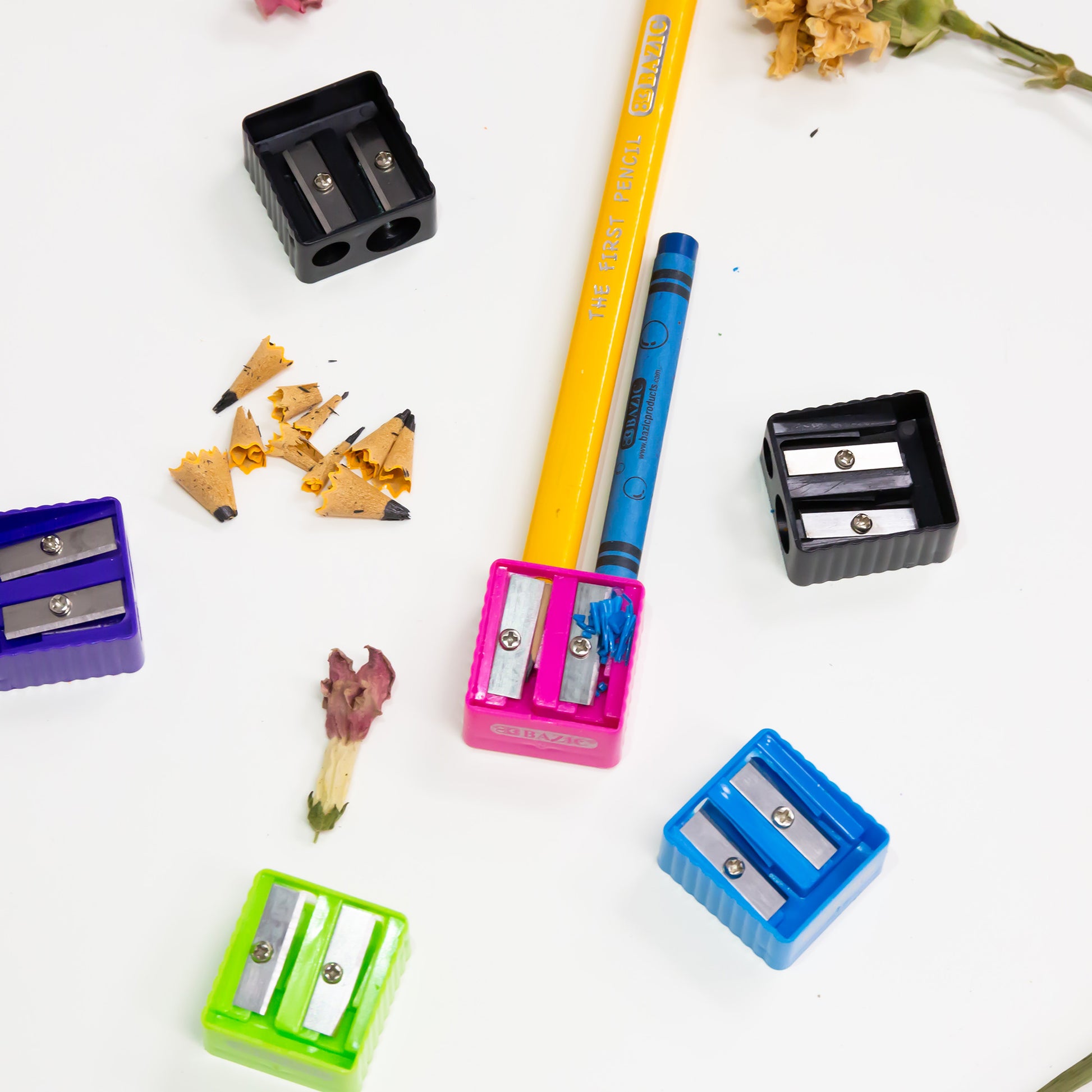 - 2 HOLE SHARPENING. Measure 1.4" x 1.2" x 0.6". Double blades sharpeners accommodates Regular/Oversized/Jumbo/Colored pencils. Available color: blue, green, black, pink, purple.