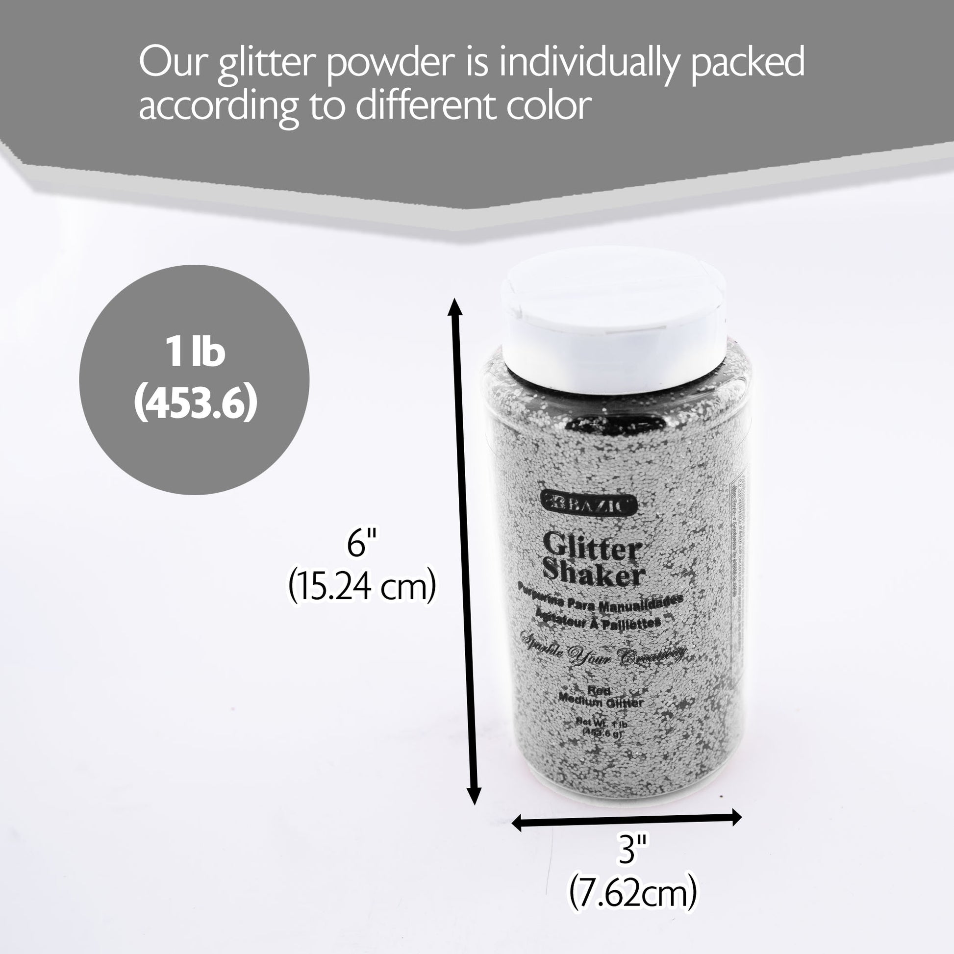 - GLITTER SHAKERS. Our glitter powder is individually packed according to different color, 16oz per jar. You can use for a long time as glitter comes in container with lid for convenient and easy use.