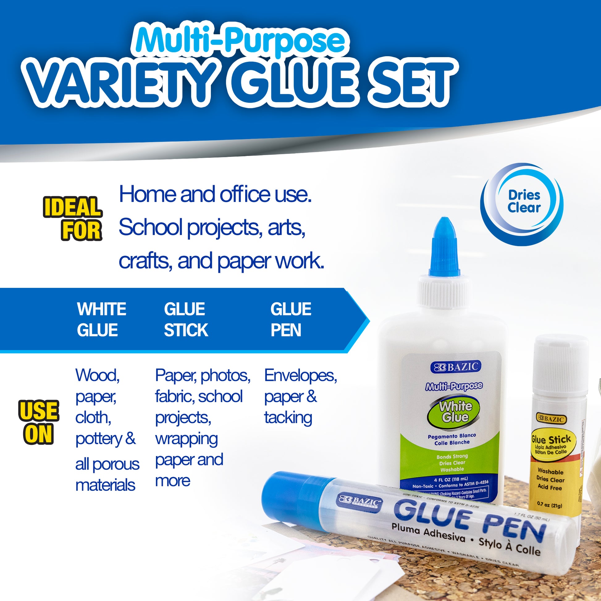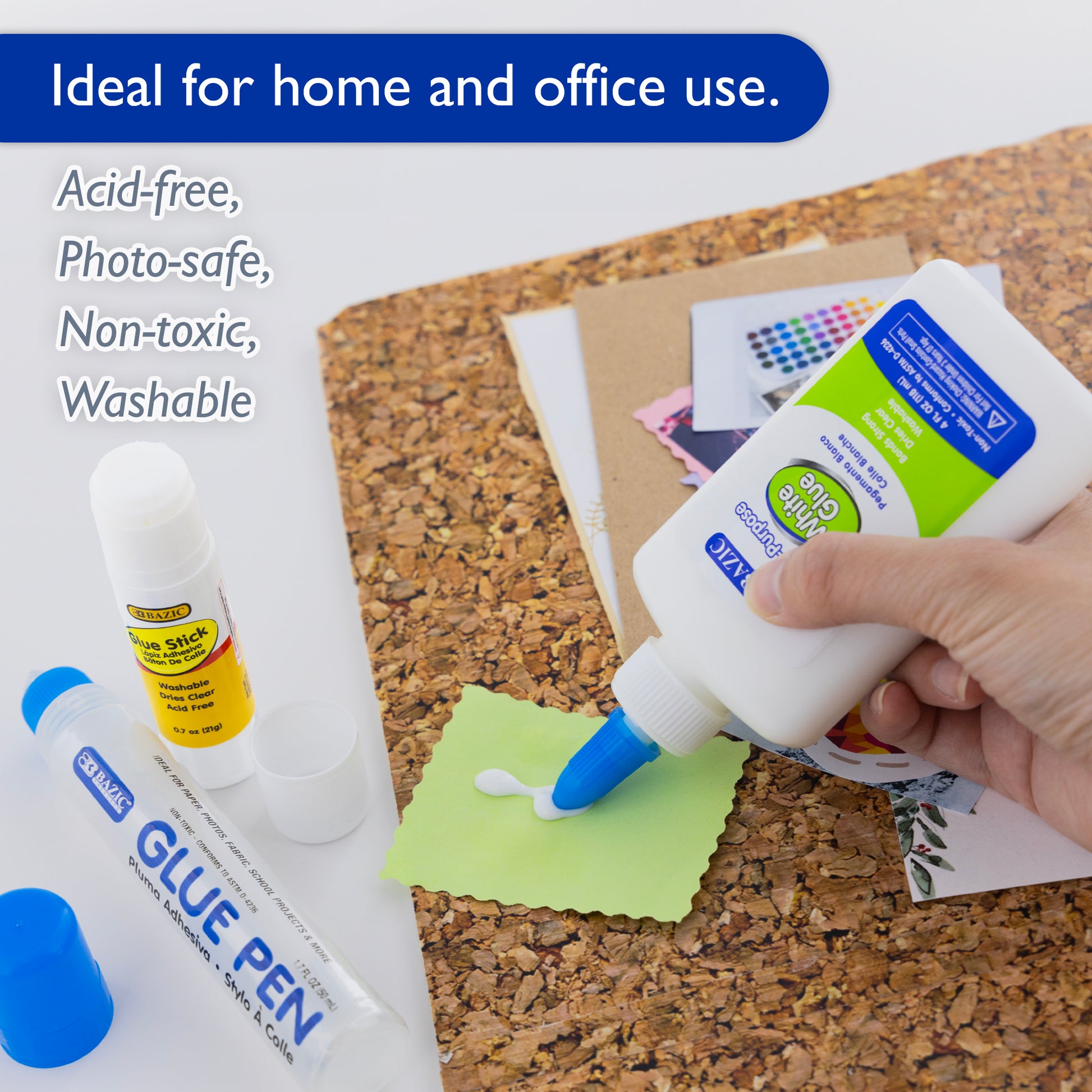 - VALUE PACK. Include White glue 4oz, Glue Stick 0.7oz, Liquid Glue Pen 1.7oz.. Acid-free, photo-safe and non-toxic. Clean easily off from hands and some clothes.