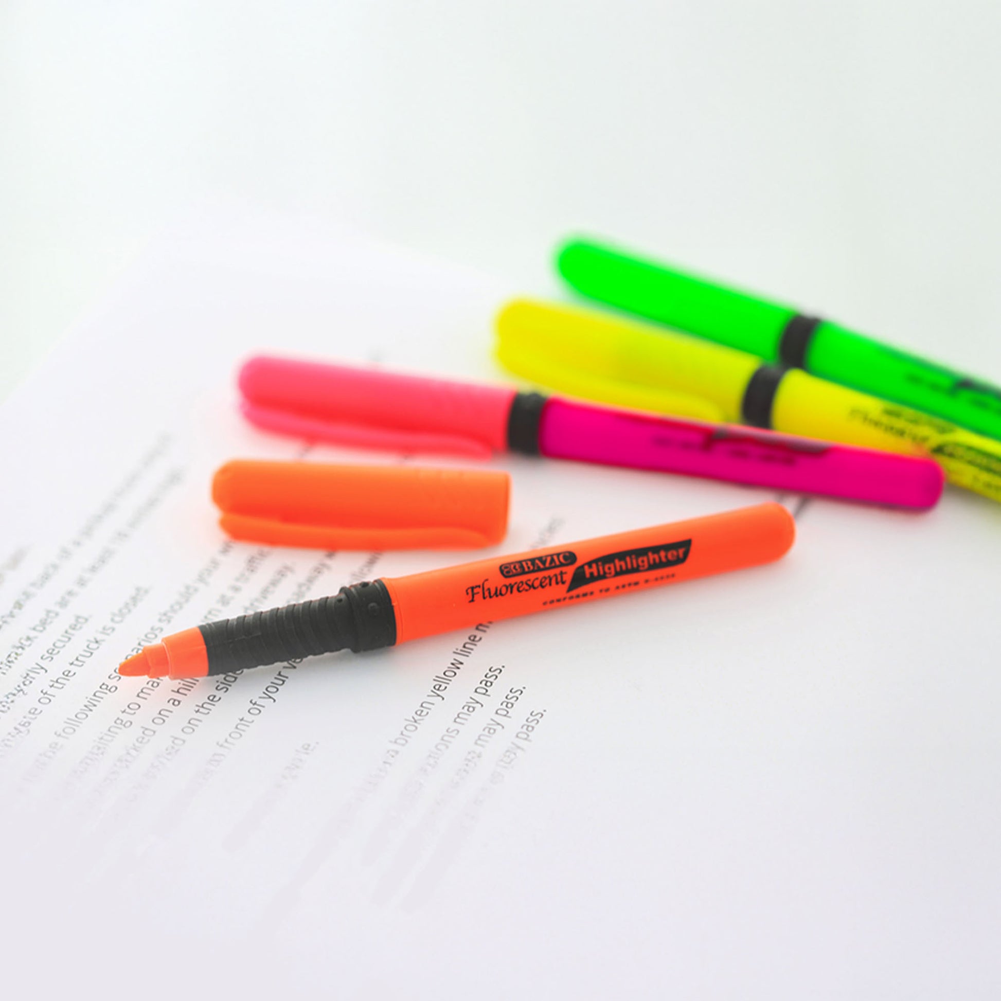 - VIVID COLOR. The vivid fluorescent highlighters provide maximum impact and instantly draws your eye to the key details and important information. Barrel color indicates ink color.