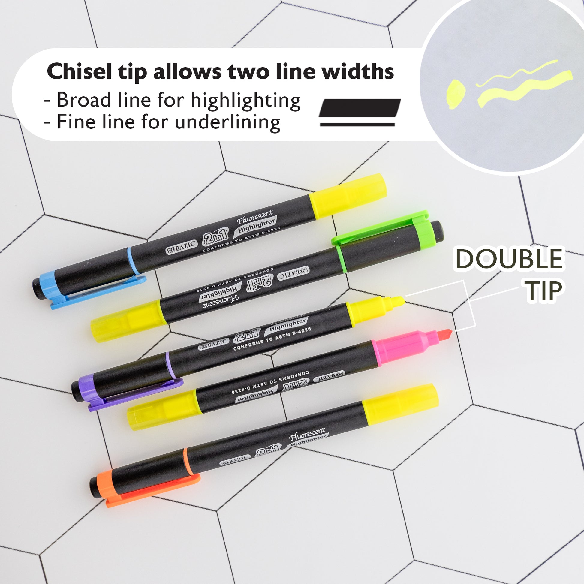 - VERSATILE CHISEL TIP. Double tip highlighter has a molded narrow chisel tip which allows two line widths. Broad-line for highlighting and Fine-line for underlining details with just a twist of the wrist.