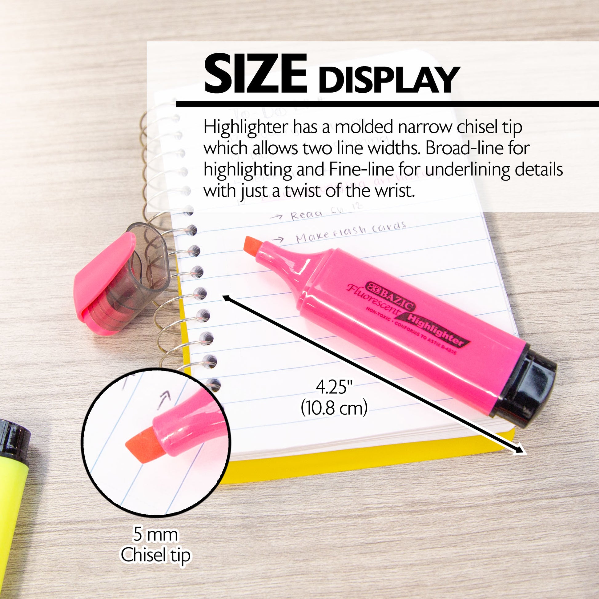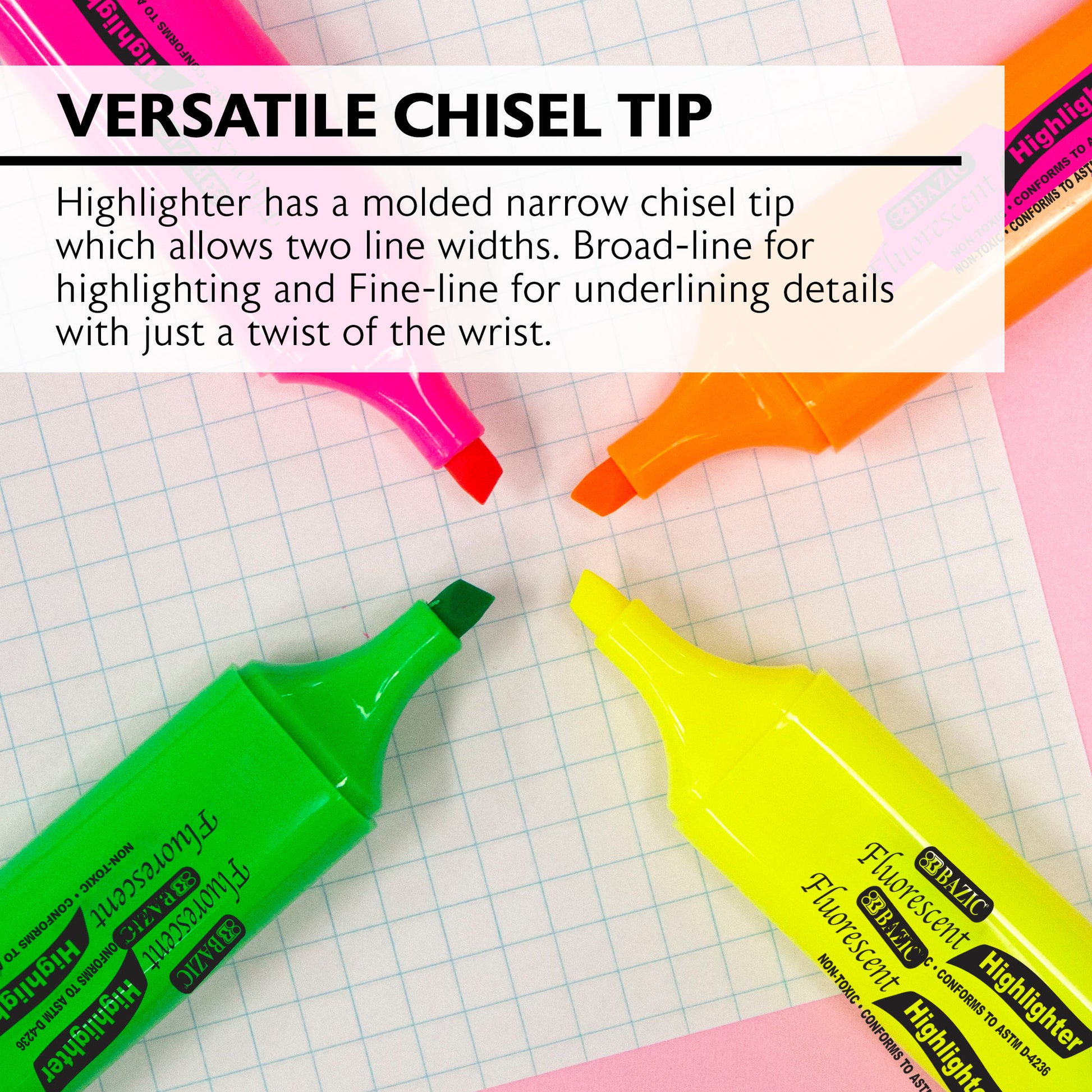 - VERSATILE CHISEL TIP. Highlighter has a molded narrow chisel tip which allows two line widths. Broad-line for highlighting and Fine-line for underlining details with just a twist of the wrist.