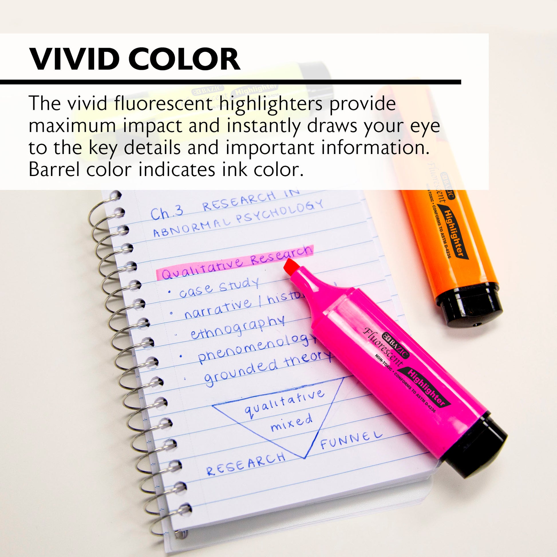 - VIVID COLOR. The vivid fluorescent highlighters provide maximum impact and instantly draws your eye to the key details and important information. Barrel color indicates ink color.