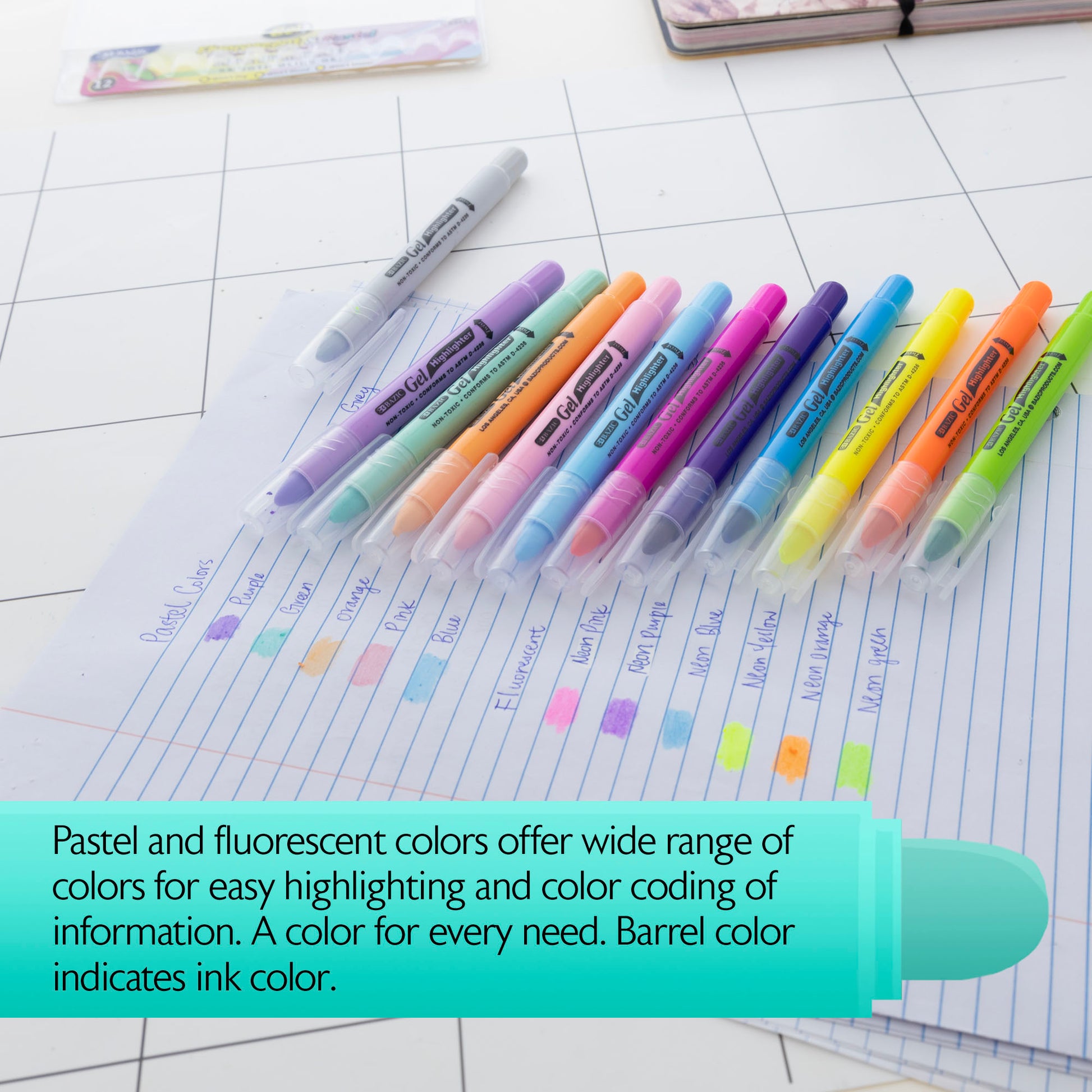 - PASTEL & FLUORESCENT. Assortment of pastel and fluorescent colors offer wide range of colors for easy highlighting and color coding of information. A color for every need. Barrel color indicates ink color.