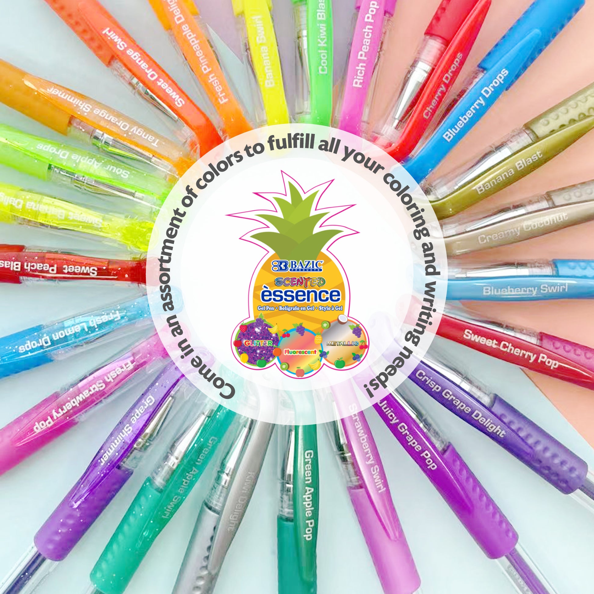 - PARTY PACK GEL PENS. All in one juicy fruity scented gel pens include Glitter, Neon, and Metallic. Come in an assortment of colors to fulfill all your coloring and writing needs!