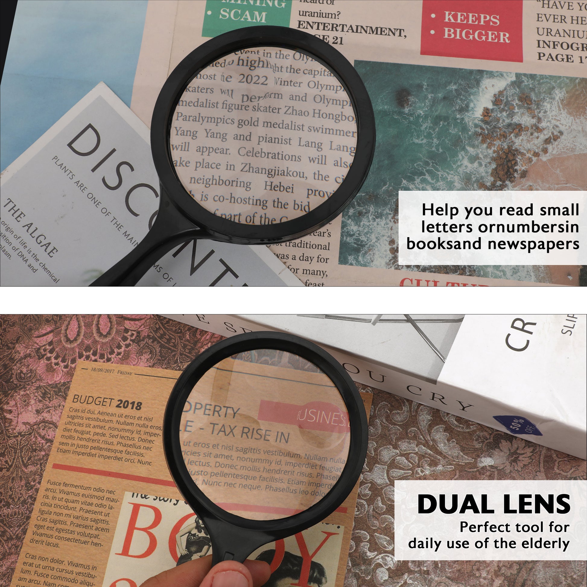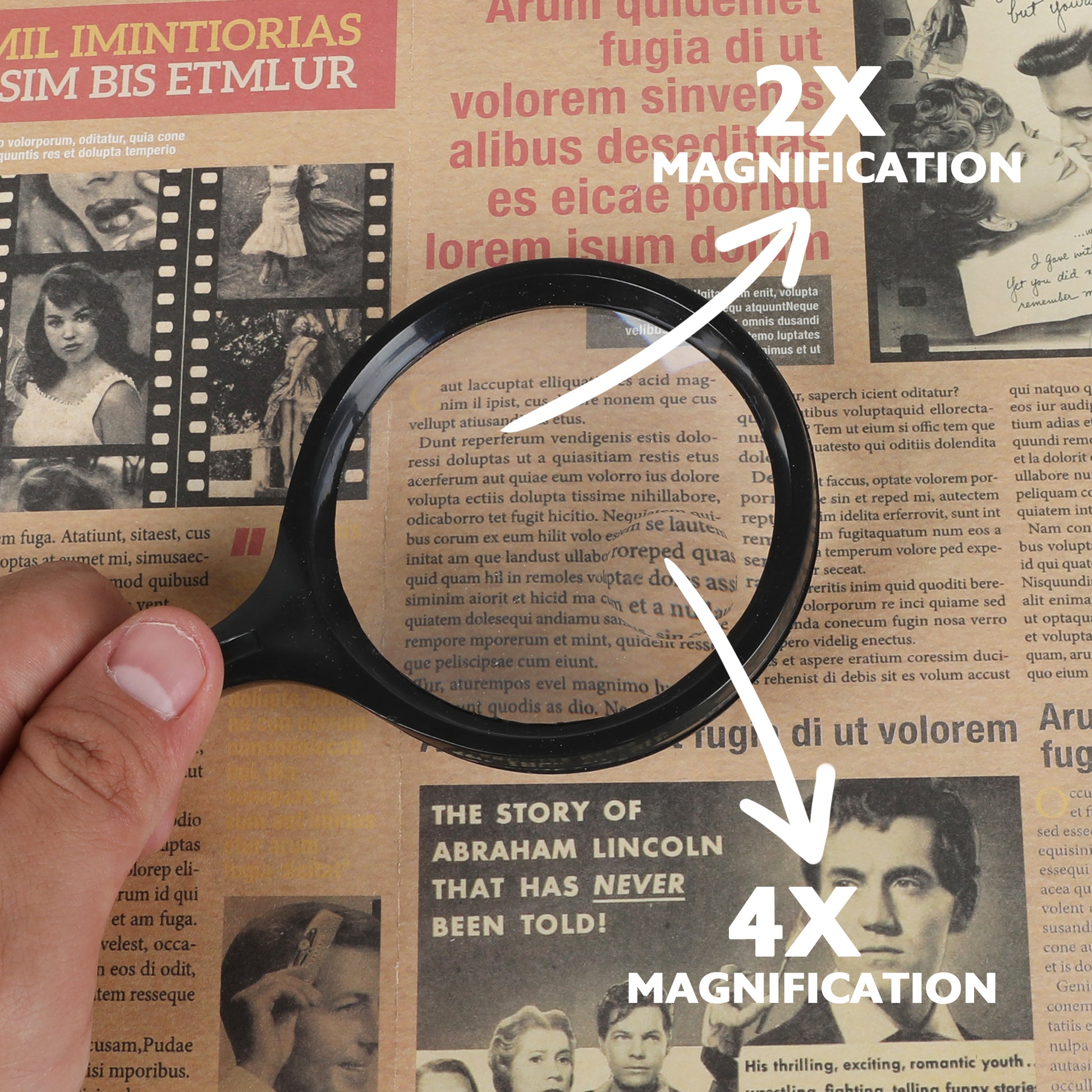 - BIFOCAL. Magnifier comes with bifocal glass lens, the large lens for distant vision (2X magnification) and the small lens for near vision (4X magnification). Perfect for your personal and professional tasks.