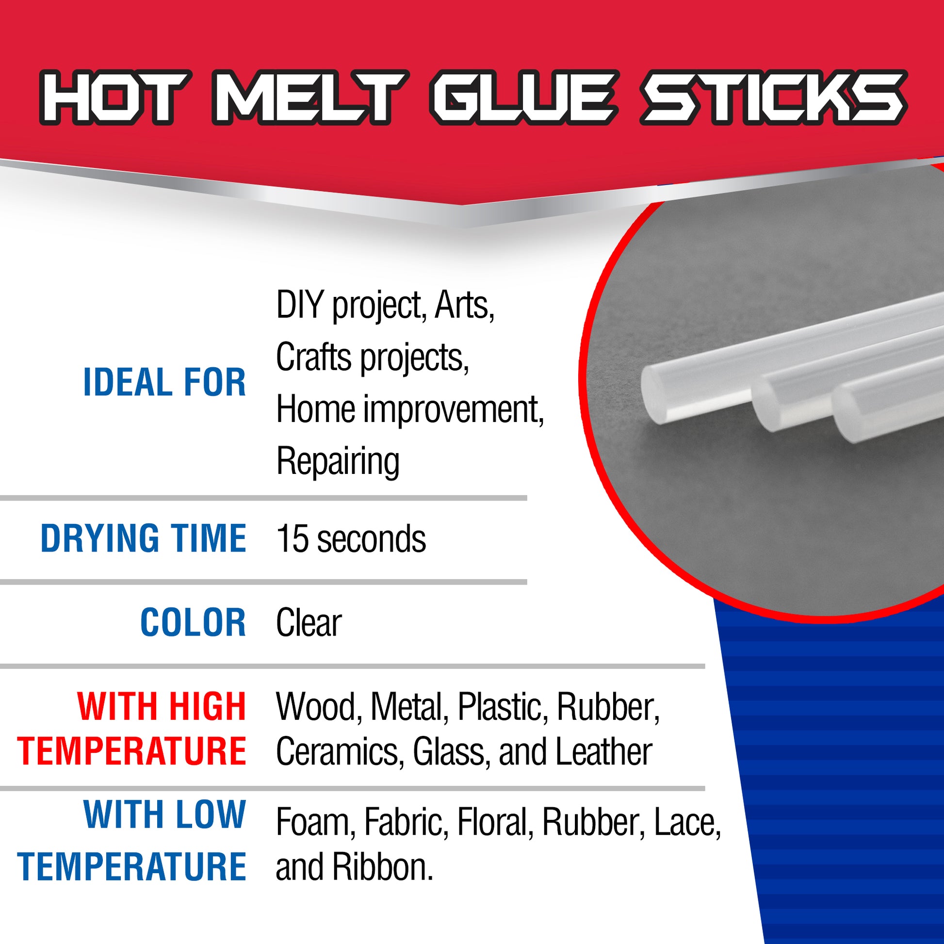 - LOW TEMP. Bonds to Foam, Fabric, Floral, Rubber, Lace, and Ribbon. Easily melts and sticks to most surfaces.