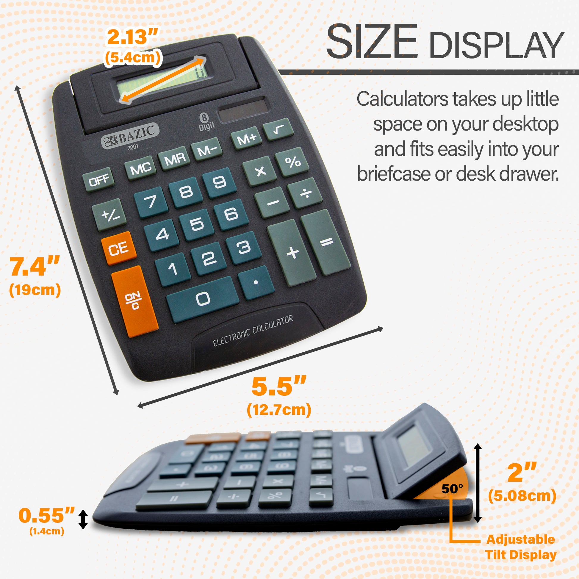 - DESKTOP Size. Measure: 7.4" x 5.5" x 0.3". This easy to use calculators takes up little space on your desktop and fits easily into your briefcase or desk drawer.
