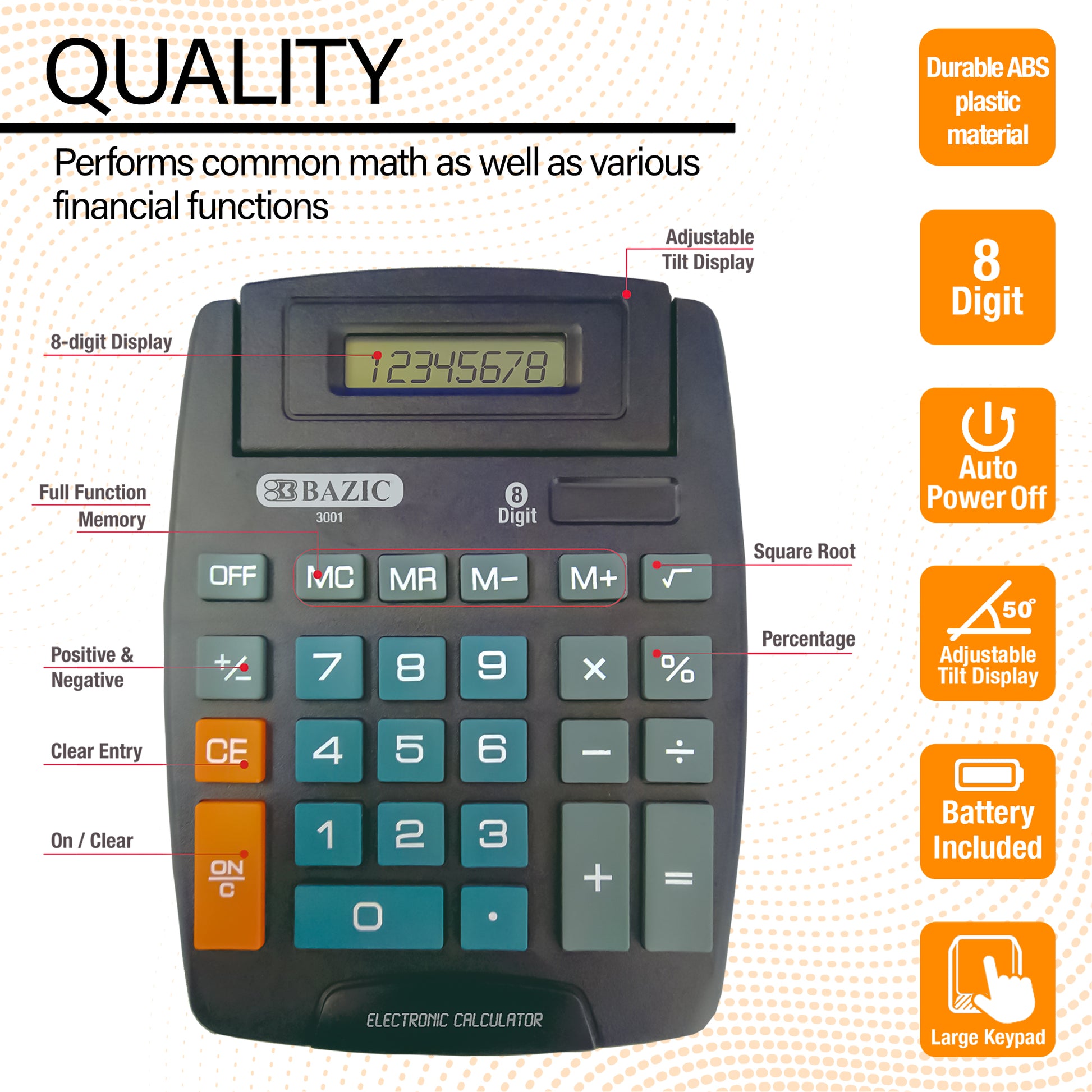 - BRILLIANT DESIGN. Standard 8 Digits display. Auto power off. Full function memory. Adjustable title display. Large keypad layout can reduce mistakes number entering.