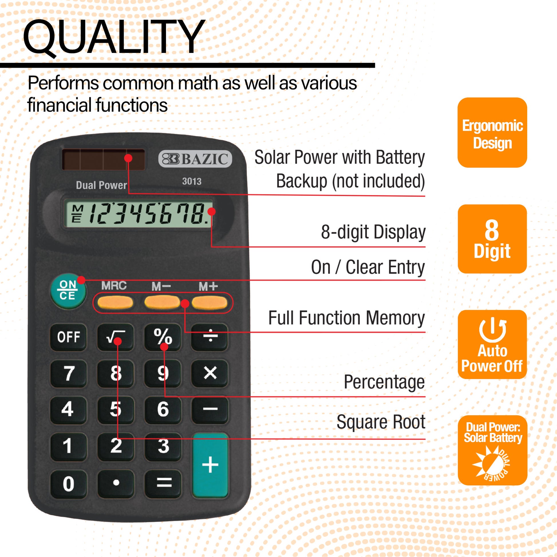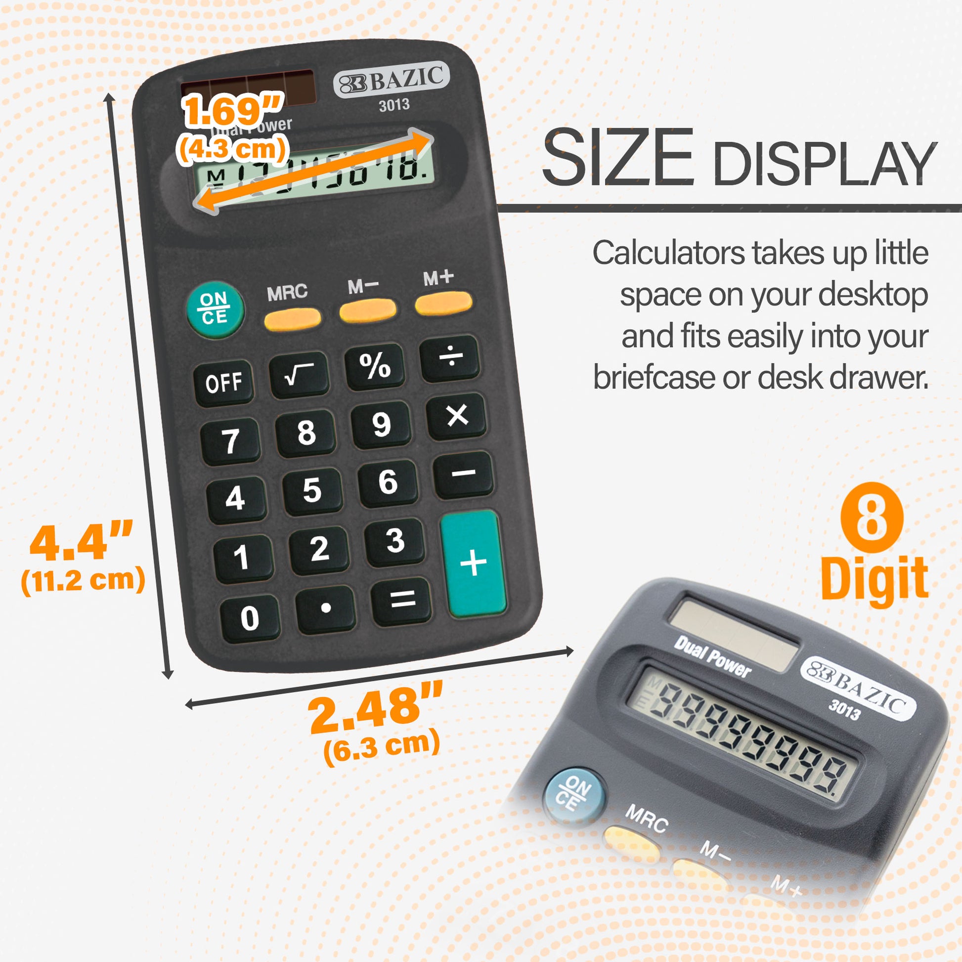 - 8-DIGIT DISPLAY. The pocket-size calculator features an 8-digit display with full function memory. Delivers efficient calculation and easy readability of numbers. Measure: 4.5" x 2.5" x 0.75"