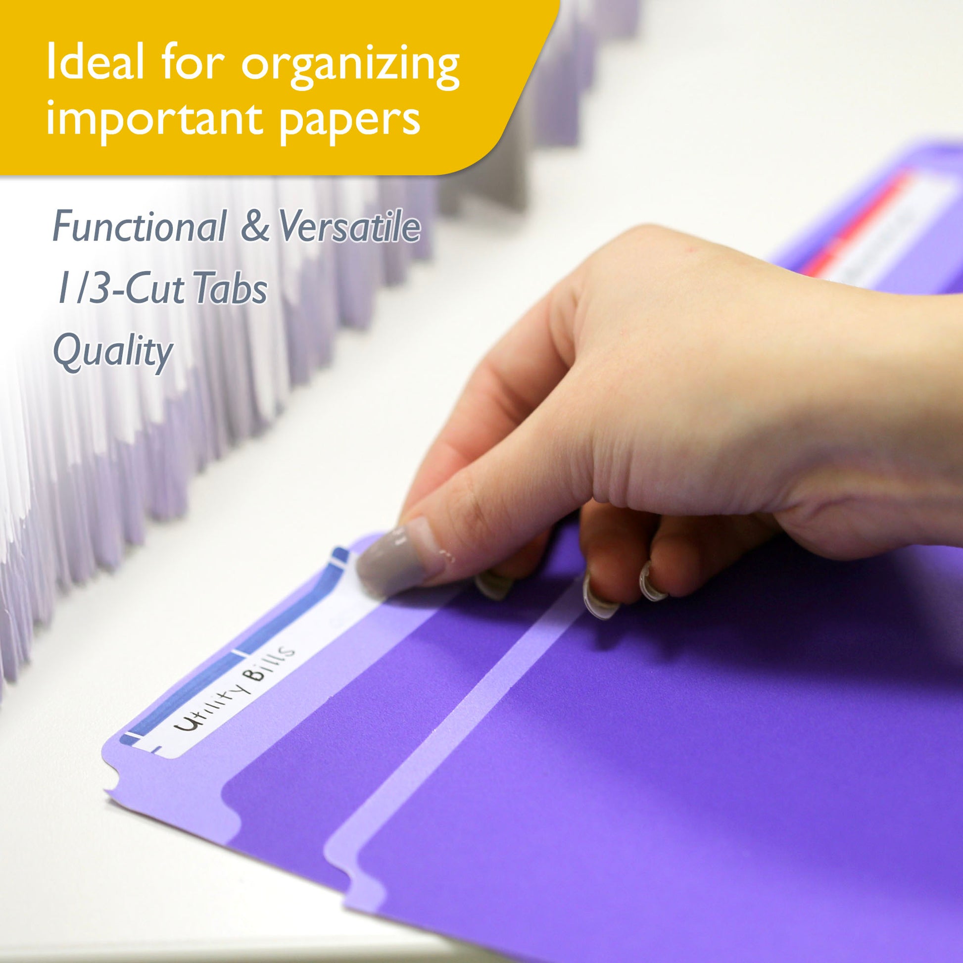 - 1/3-CUT TABS IN ASSORTED POSITIONS. The folders provide 1/3-cut assorted-position tabs from left to right for perfect visibility in your vertical or lateral file cabinet.