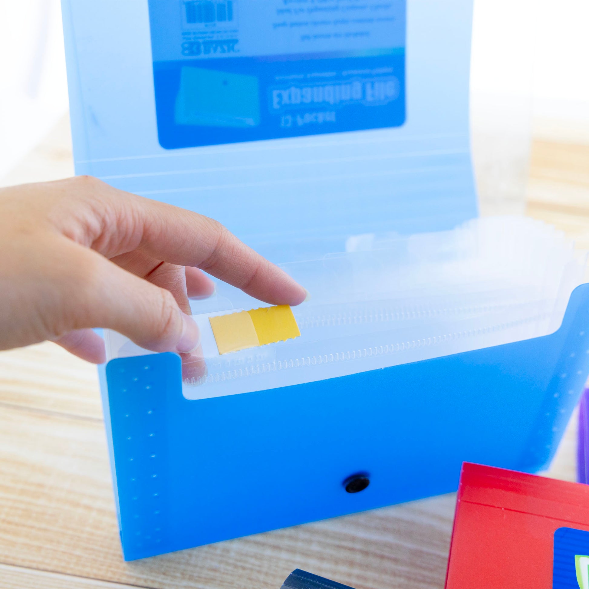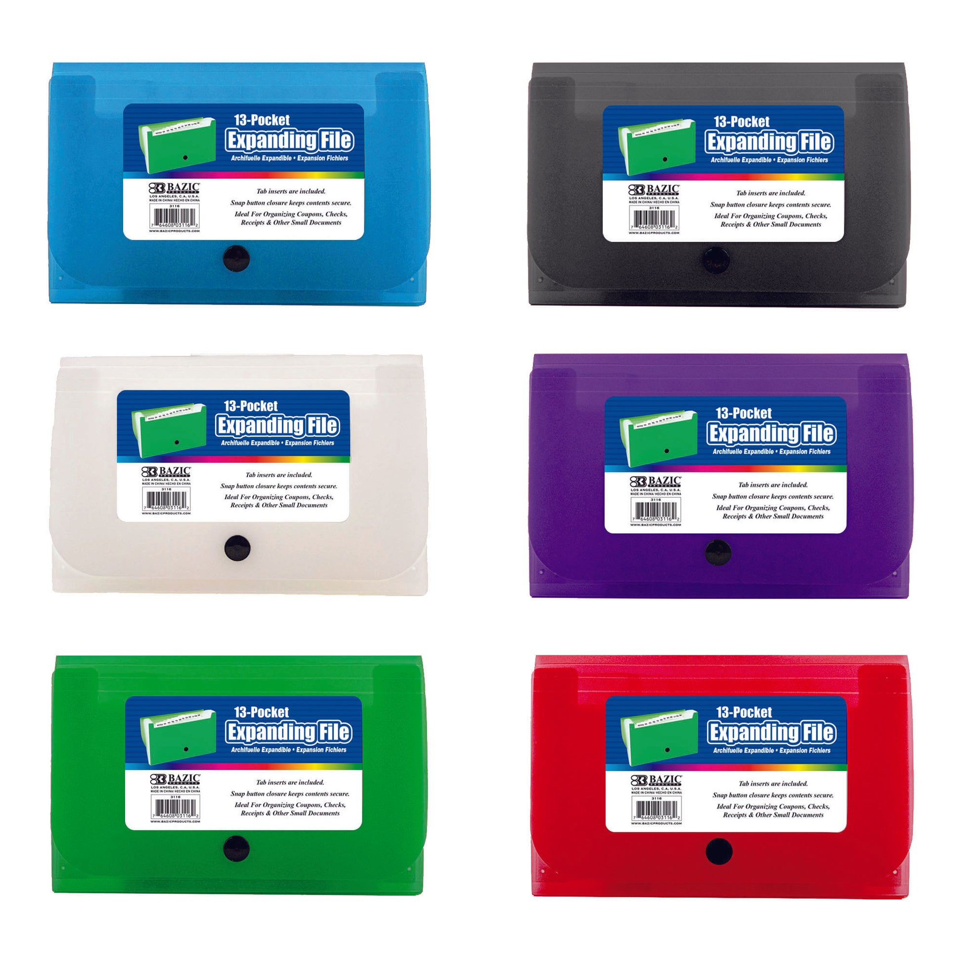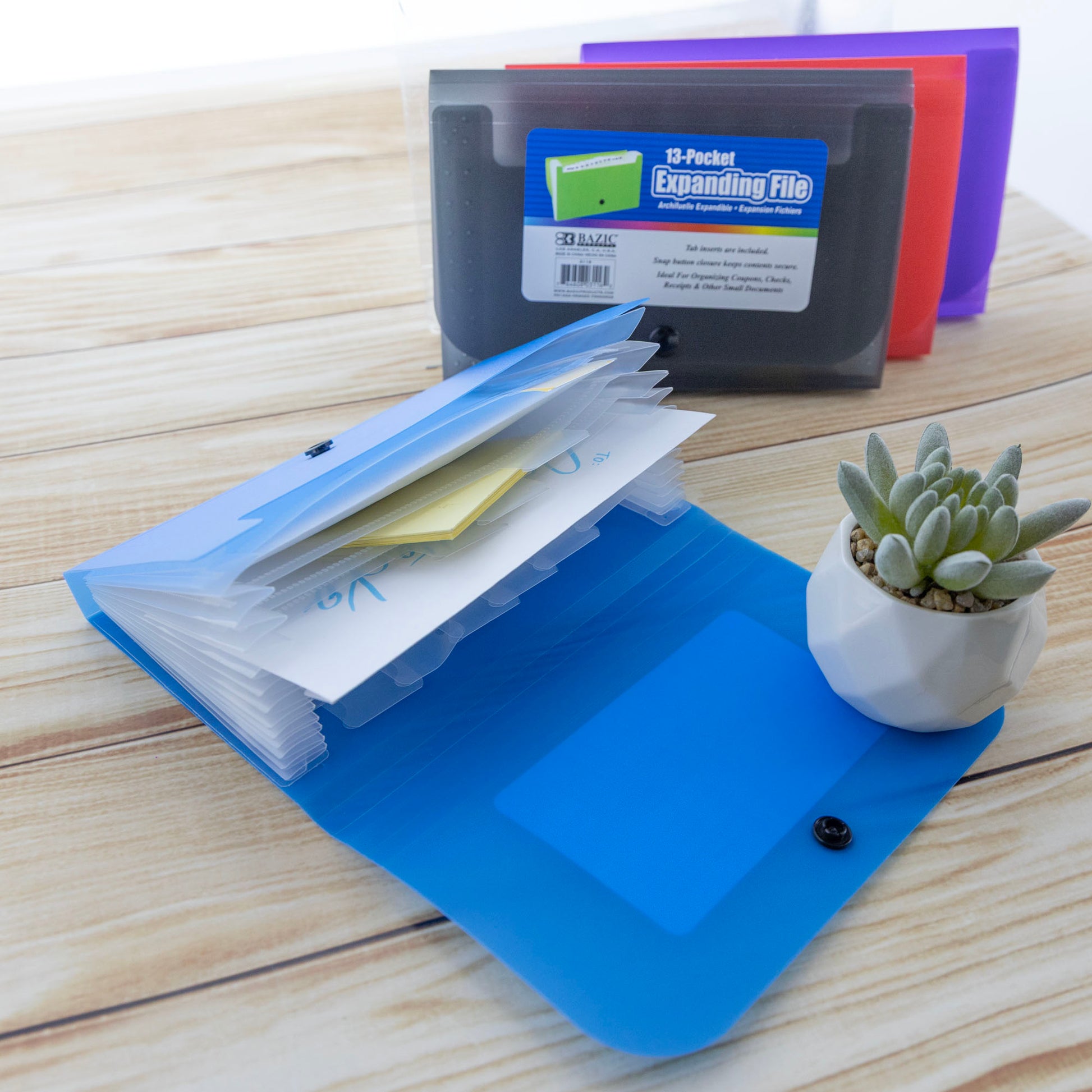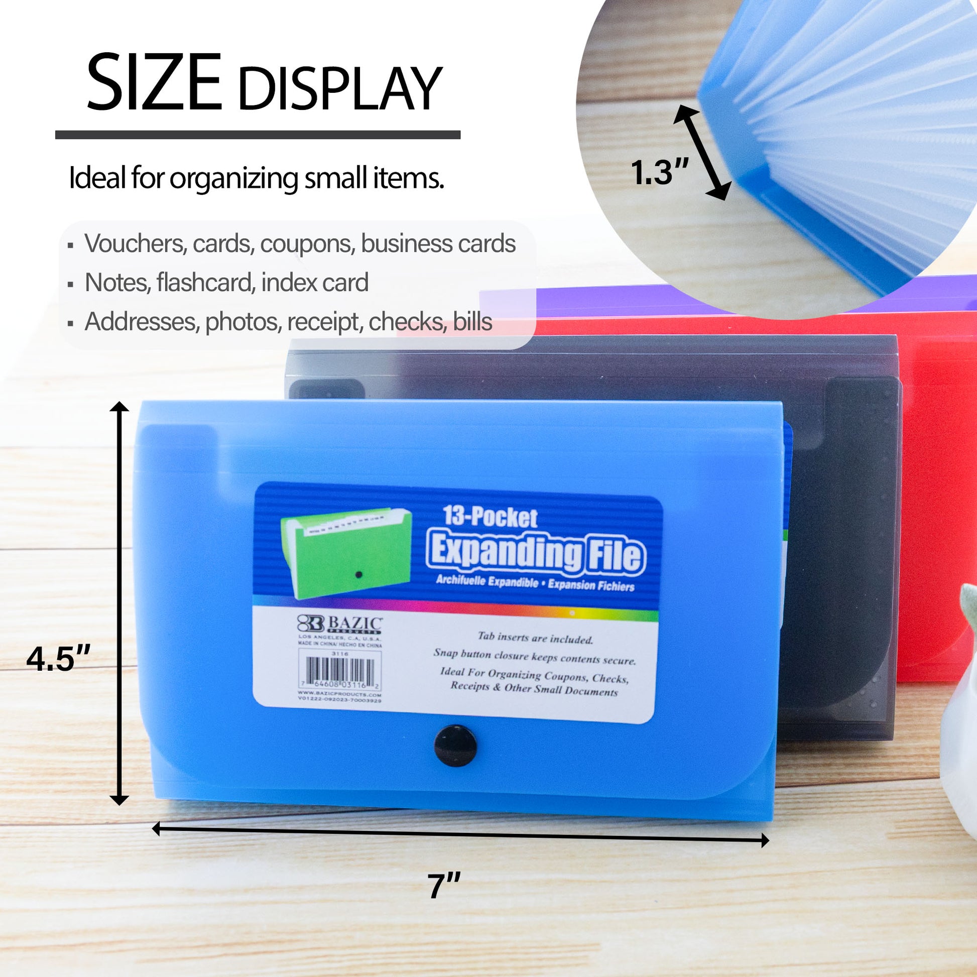 - FILE ORGANIZER. Made from high quality Polypropylene (PP) Plastic material. Safe & Non Toxic. Measure: 7" x 4.5" x 1.3". Expandable with 13 pockets. 5 colors insert card included for categories.