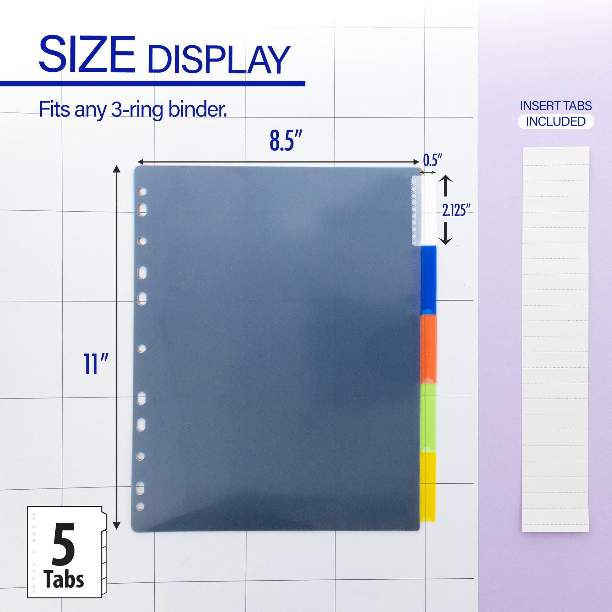 - CUSTOMIZABLE. 5/pack tabs allow categorization within a single file folder. Feature 11 ring hole to fit any 3-ring binder. Measure: 11" x 8.9". Blank white labels included to help create tab titles.