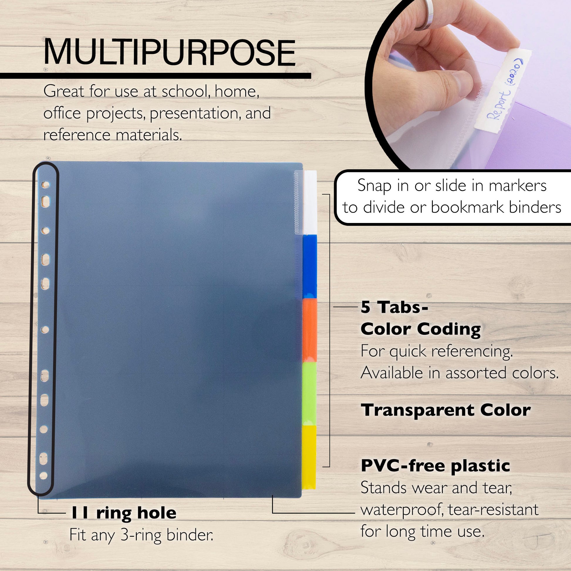 - MULTIPURPOSE. Great for use at school, home, office projects, presentation, and reference materials. Snap in or slide in markers to divide or bookmark ring binders or spiral notebooks.