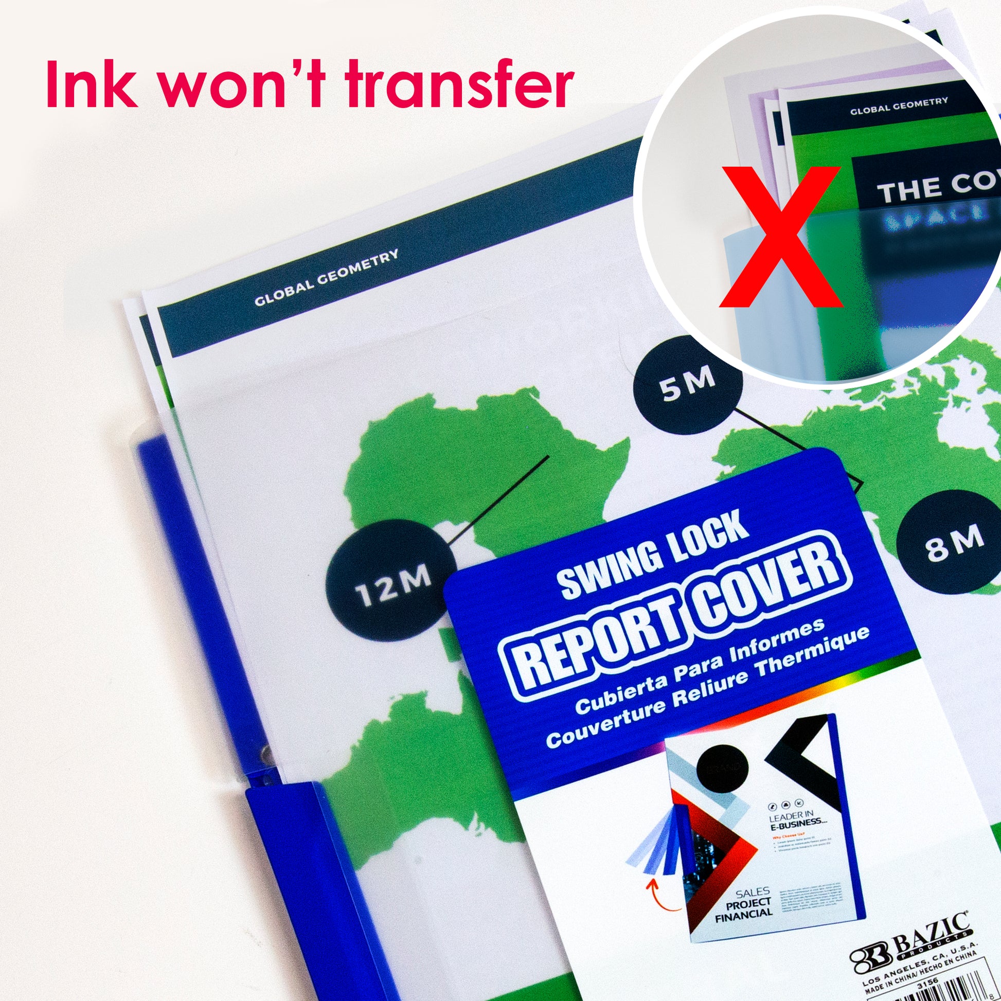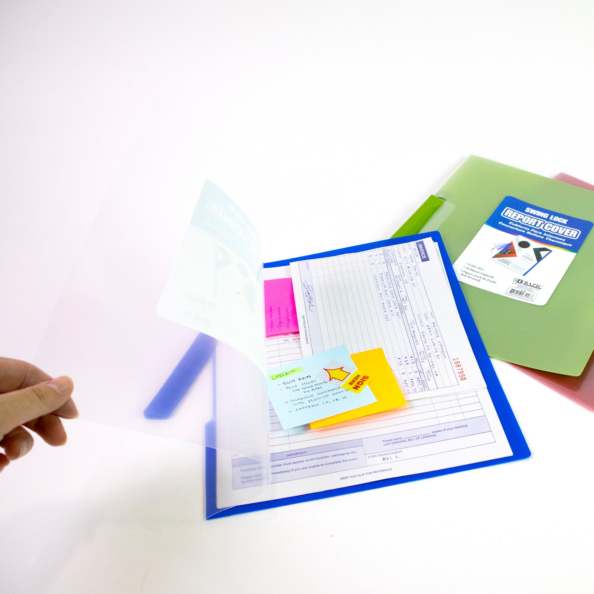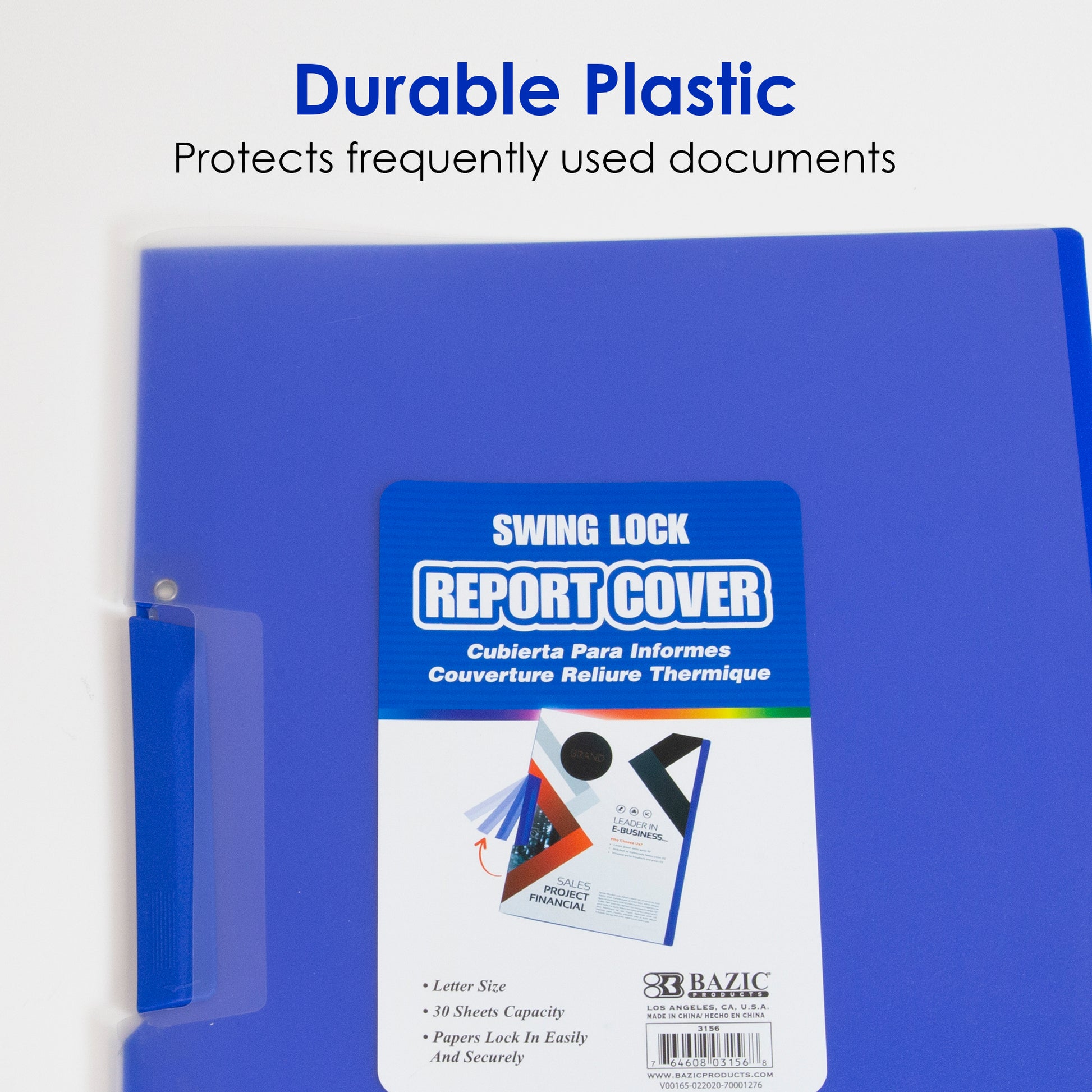 - CLEAR FRONT REPORT COVERS w/ SWING LOCK. Clear Front Report Covers come in assorted colors Useful product for presentations, files or other similar items.