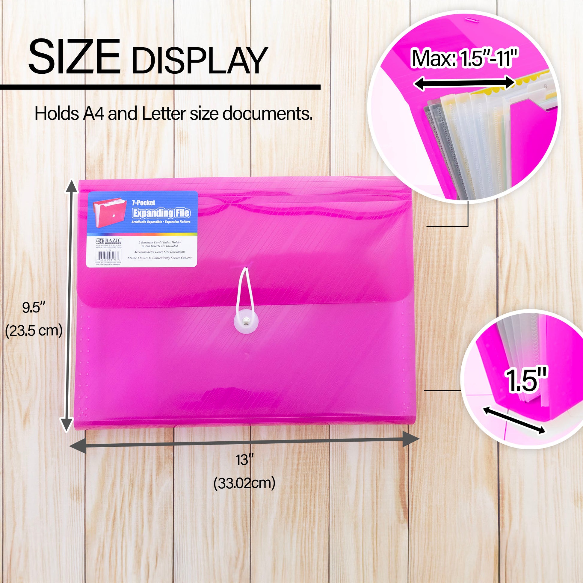 - FILE ORGANIZER. Made from high quality Polypropylene (PP) Plastic material. Safe & Non Toxic. Measure: 13" x 9.4" x 1.8". Expandable with 7 pockets. Fits both A4Size and Letter Size.
