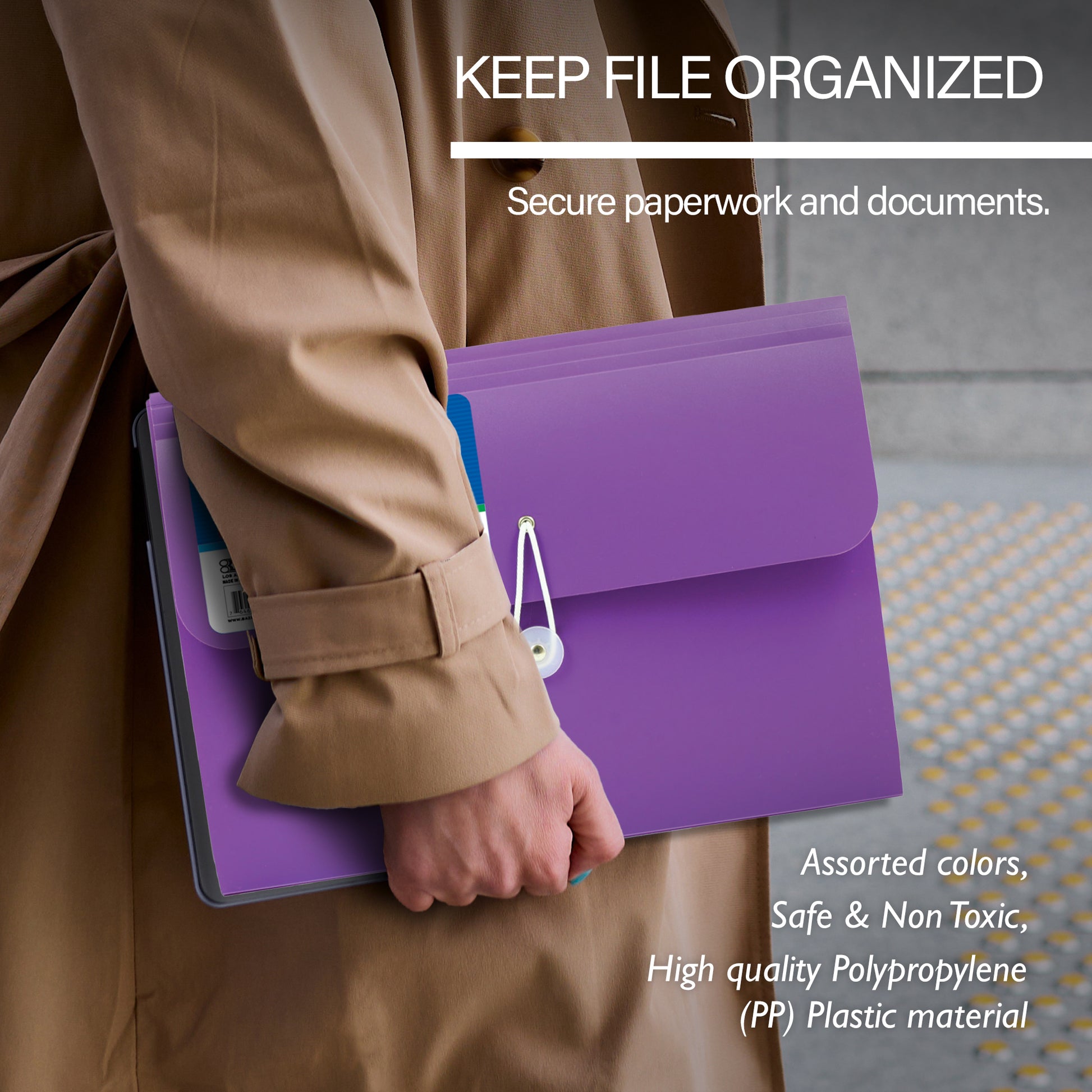 - FILE ORGANIZER. Made from high quality Polypropylene (PP) Plastic material. Safe & Non Toxic. Measure: 13" x 9.4" x 1.8". Expandable with 7 pockets. Fits both A4Size and Letter Size.