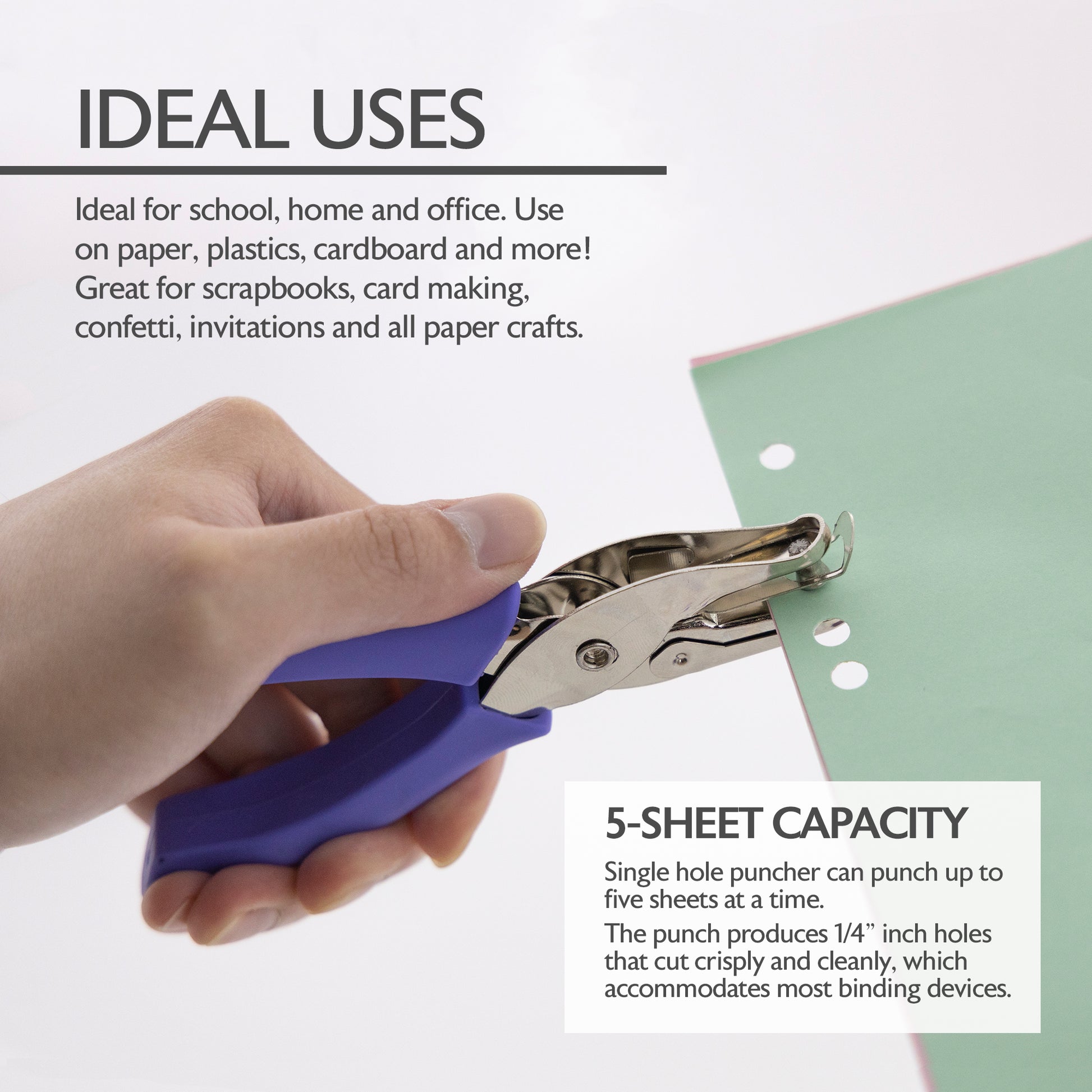 - 5-SHEET CAPACITY. Single hole puncher can punch up to five sheets at a time. The punch produces 1/4" inch holes that cut crisply and cleanly, which accommodates most binding devices.