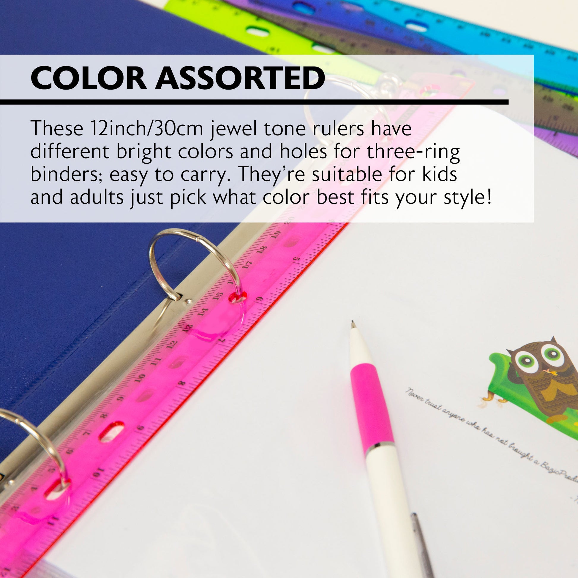 - COLOR ASSORTED. These 12inch/30cm jewel tone rulers have different bright colors and holes for three-ring binders; easy to carry. They're suitable for kids and adults just pick what color best fits your style!