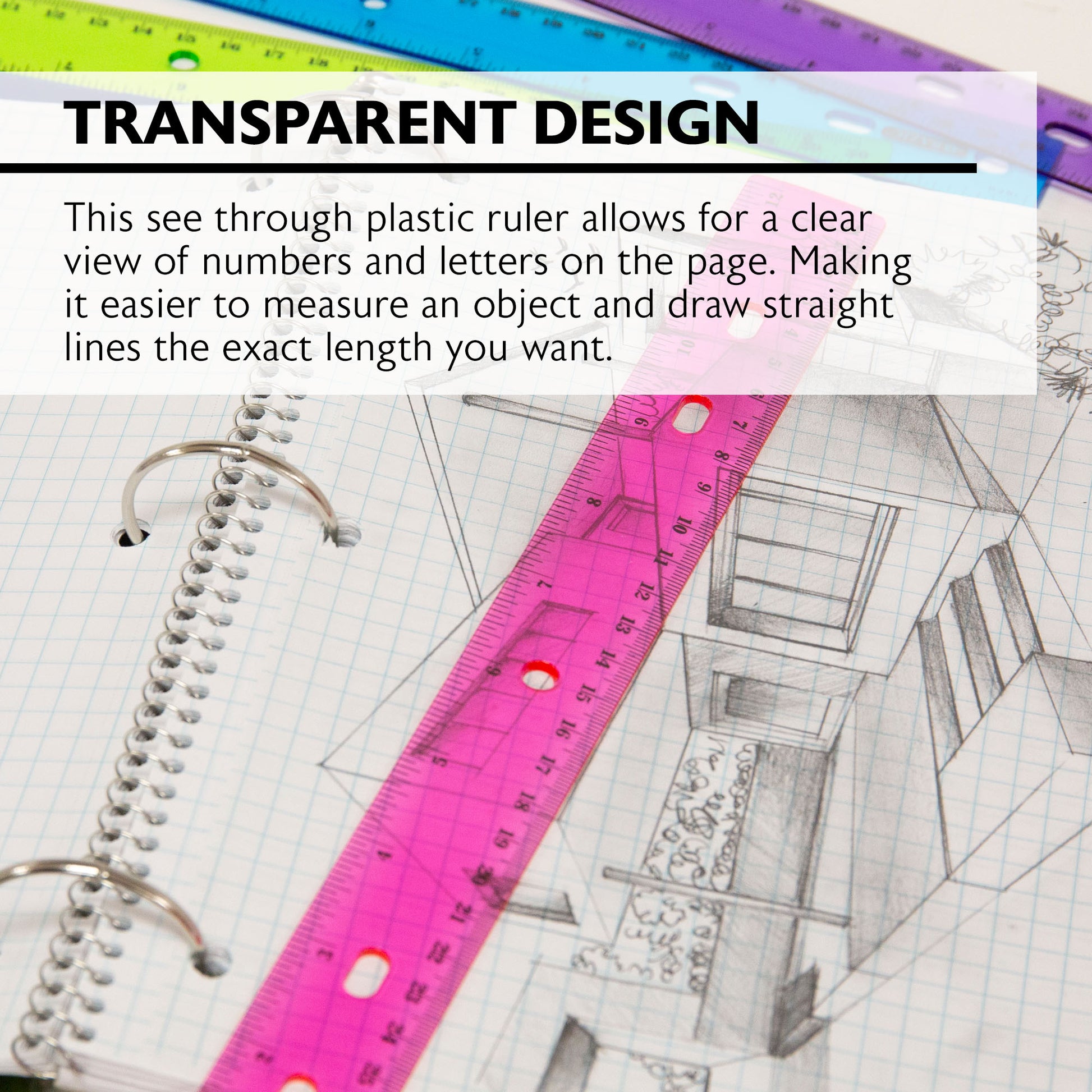 - TRANSPARENT DESIGN. This see through plastic ruler allows for a clear view of numbers and letters on the page. Making it easier to measure an object and draw straight lines the exact length you want.