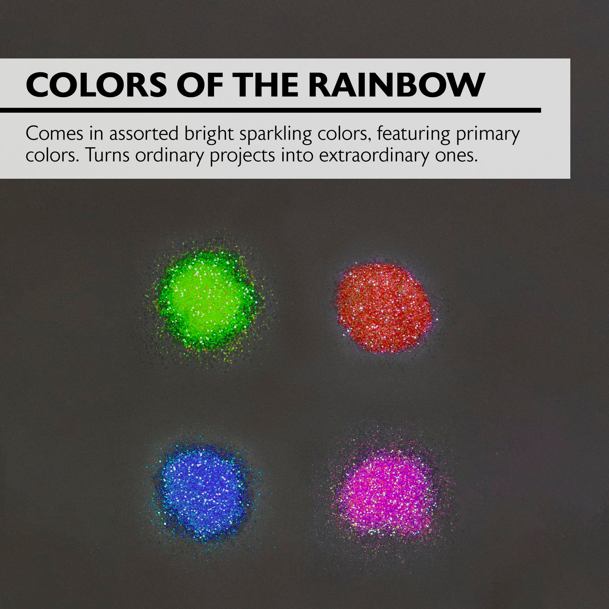 - COLORS OF THE RAINBOW. Comes in assorted bright sparkling colors, featuring primary colors. Turns ordinary projects into extraordinary ones.