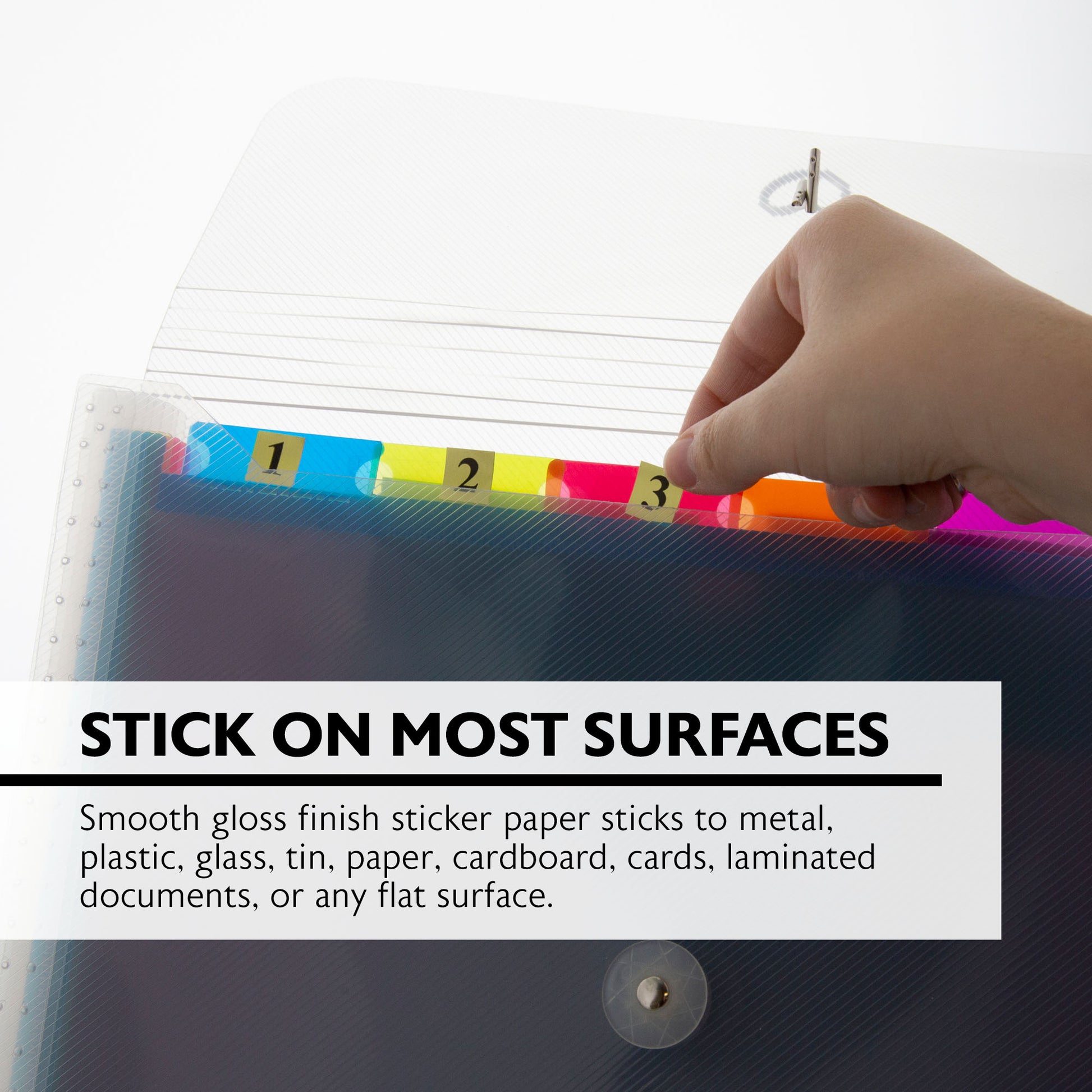 - STICK ON MOST SURFACES. Smooth gloss finish sticker paper sticks to metal, plastic, glass, tin, paper, cardboard, cards, laminated documents, or any flat surface.