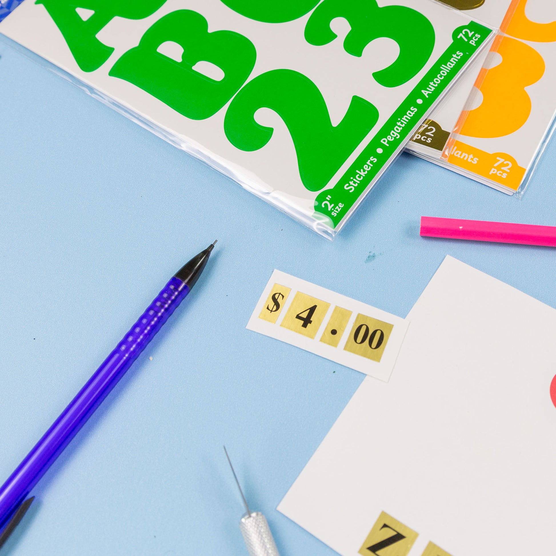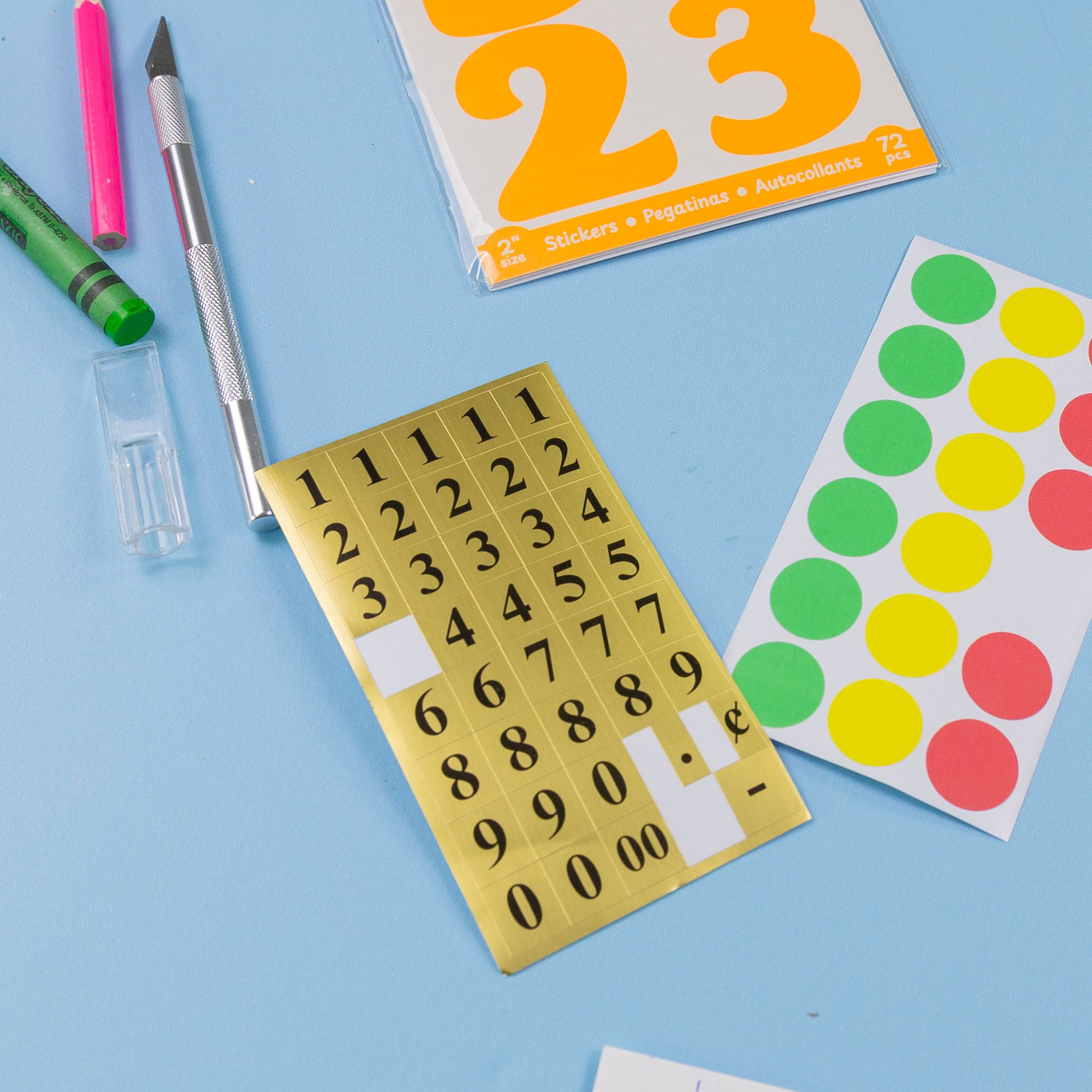 - NUMBERS STICKER. Gold foil color with black printed numbers 0-9 & 00. Also feature symbol: dollar sign, period, and hyphen. Permanent Adhesive. Measure: 1/2" x 5/8". Total 378 labels per pack.