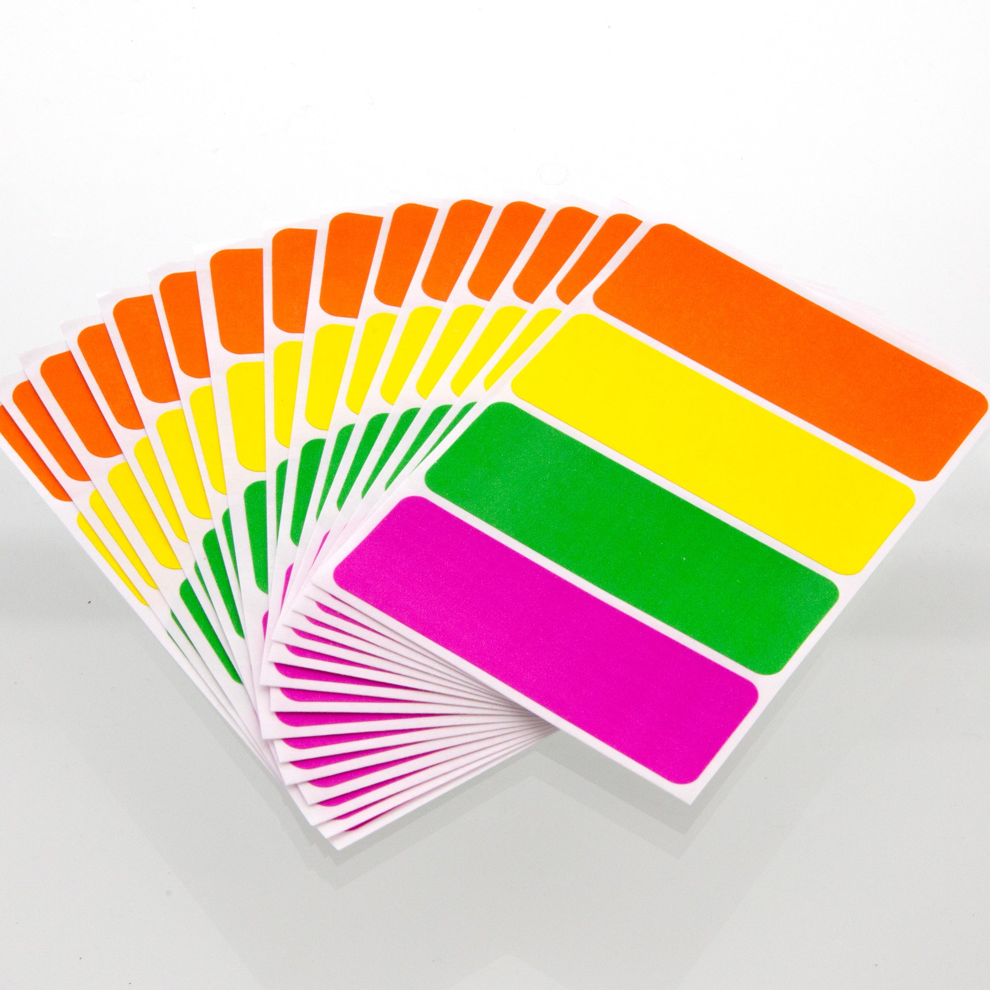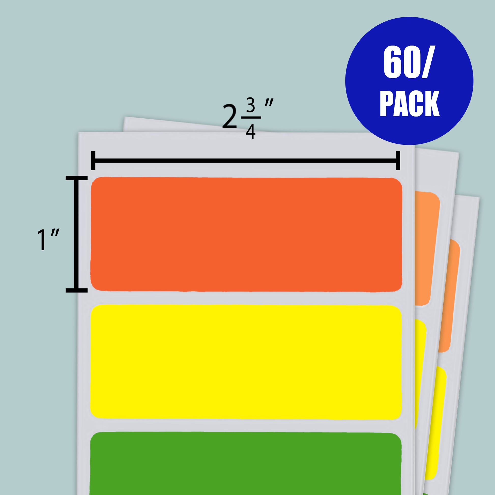 - NEON COLOR. Avaliable in 4 colors: Orange, Red, Yellow, Green. Permanent Adhesive. Measure: 2 3/4" x 1". Total 60 labels per pack.