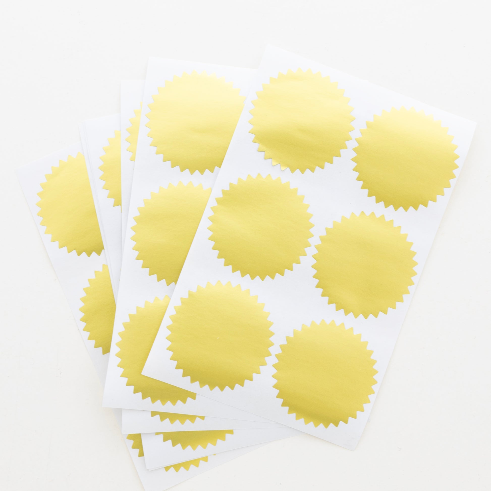 - GOLDEN STICKER. Gold foli color permanent adhesive. Measure: 2" Round. Total 42 labels per pack. Great school and office supplies. Use as envelope seals, gift packing, greeting card, etc.