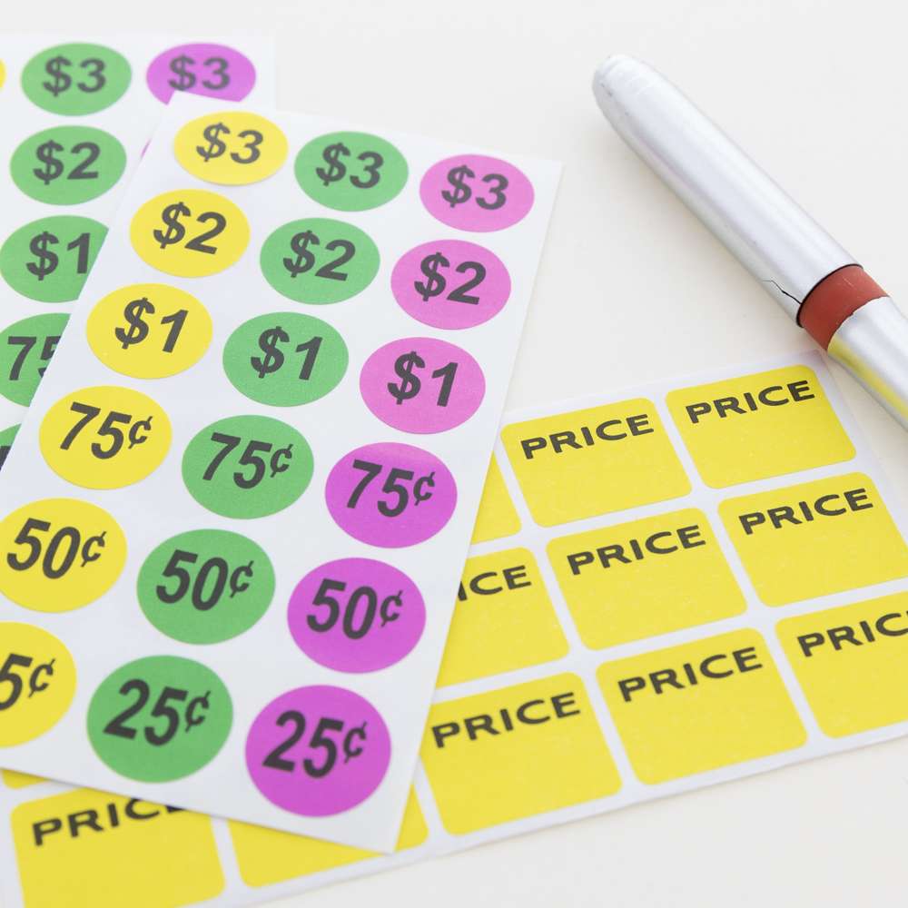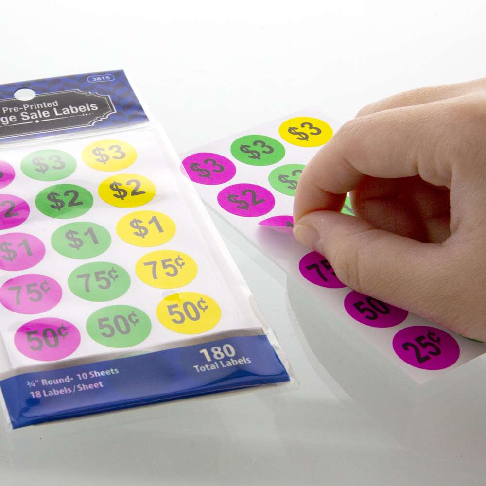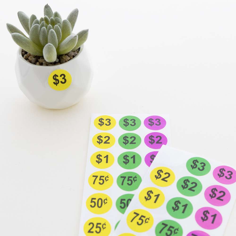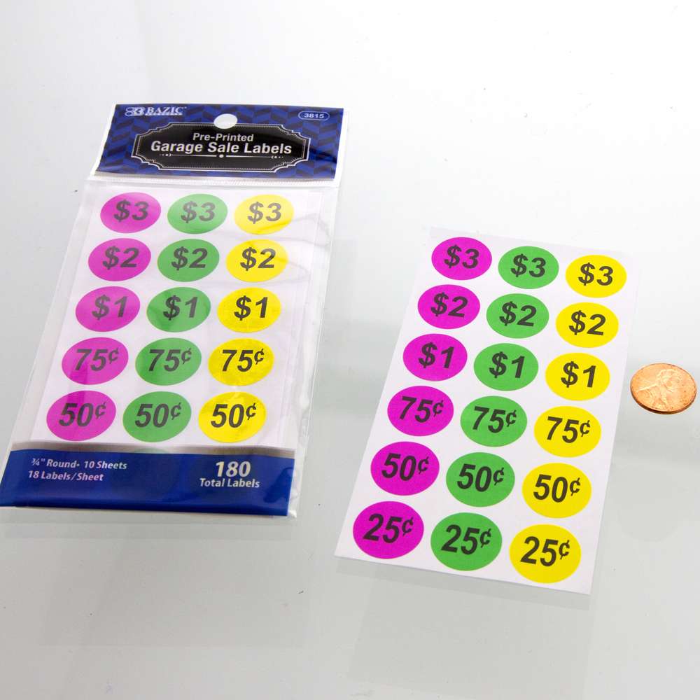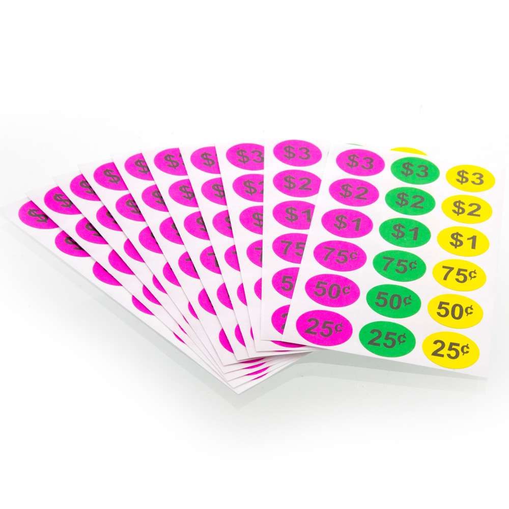 - PRICING STICKER. Available in 3 colors: Red, Yellow, and Green. Permanent adhesive with black printed price in dollars and cents. Measures 3/4" in diameter. Total 180 labels per pack.
