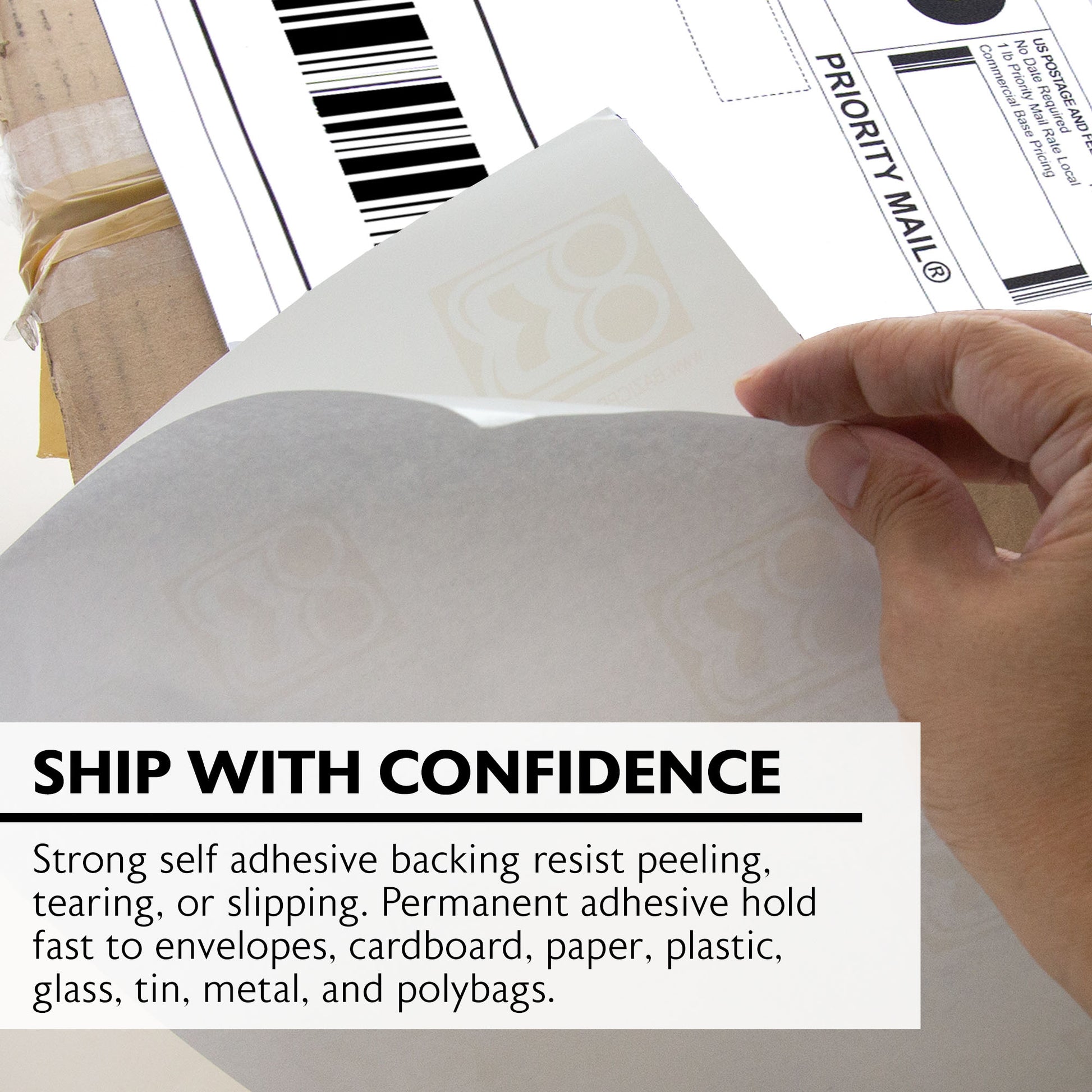- SHIP WITH CONFIDENCE. Strong self adhesive backing resist peeling, tearing, or slipping. Permanent adhesive hold fast to envelopes, cardboard, paper, plastic, glass, tin, metal, and polybags.