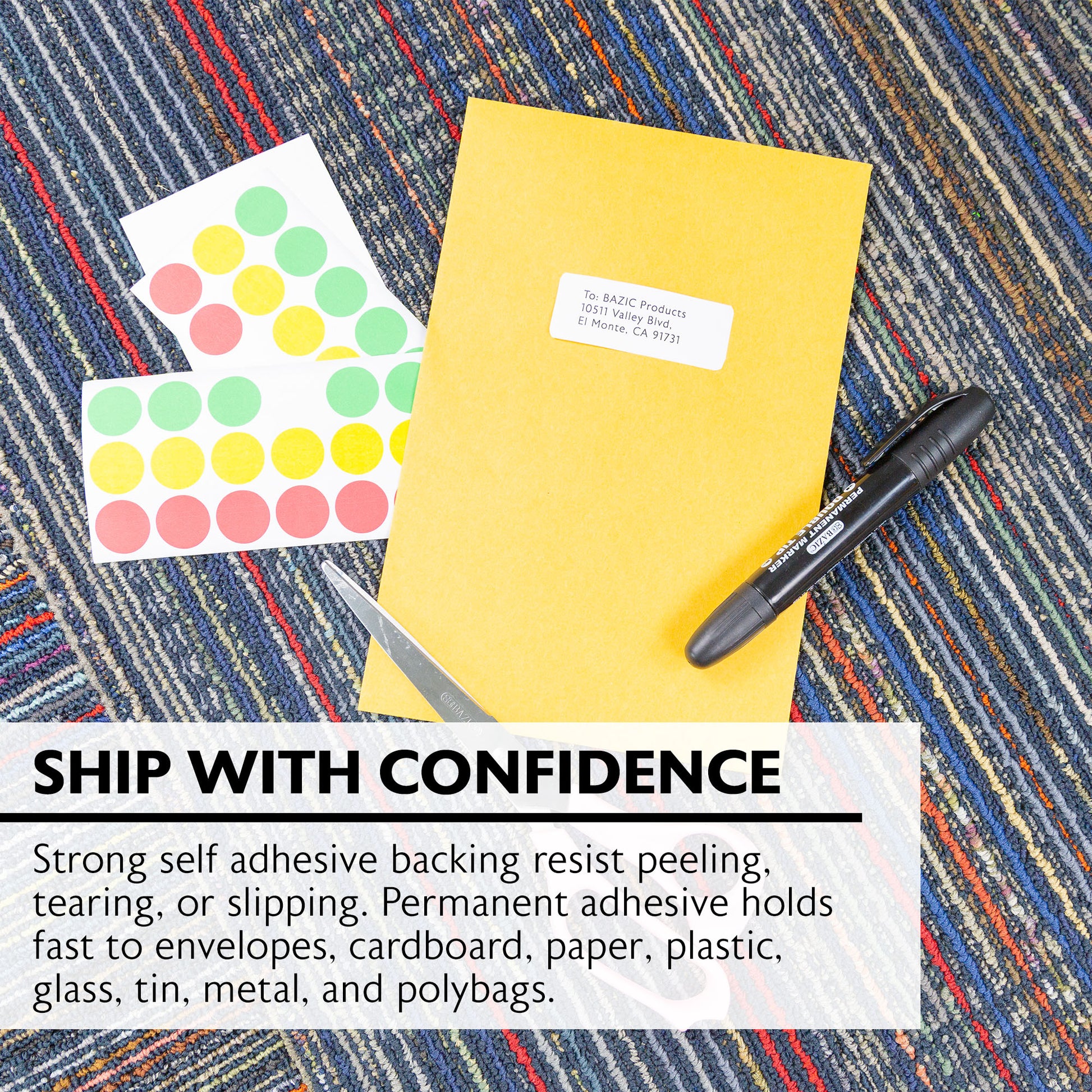 - SHIP WITH CONFIDENCE. Strong self adhesive backing resist peeling, tearing, or slipping. Permanent adhesive hold fast to envelopes, cardboard, paper, plastic, glass, tin, metal, and polybags.