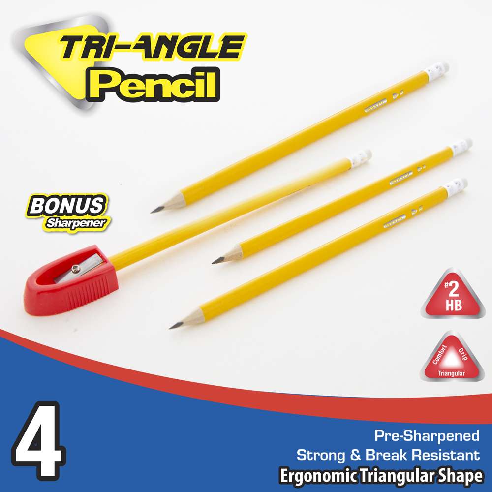 - TRI-ANGLE PENCIL W/ ERASER. Each pack comes with 4 triangular pre-sharpened pencils; 1 sharpener included. Easy to erase and easy to sharpen with any quality sharpener.