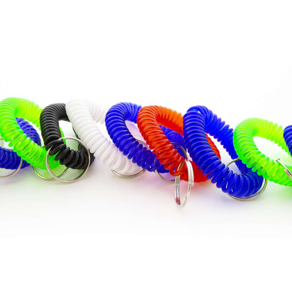 - ASSORTED COLORS. Wrist coils come in 5 assorted colors of White, Blue, Red, Green, and Black. Great colors for identifying different keys for different locks. Actual Colors May Vary!