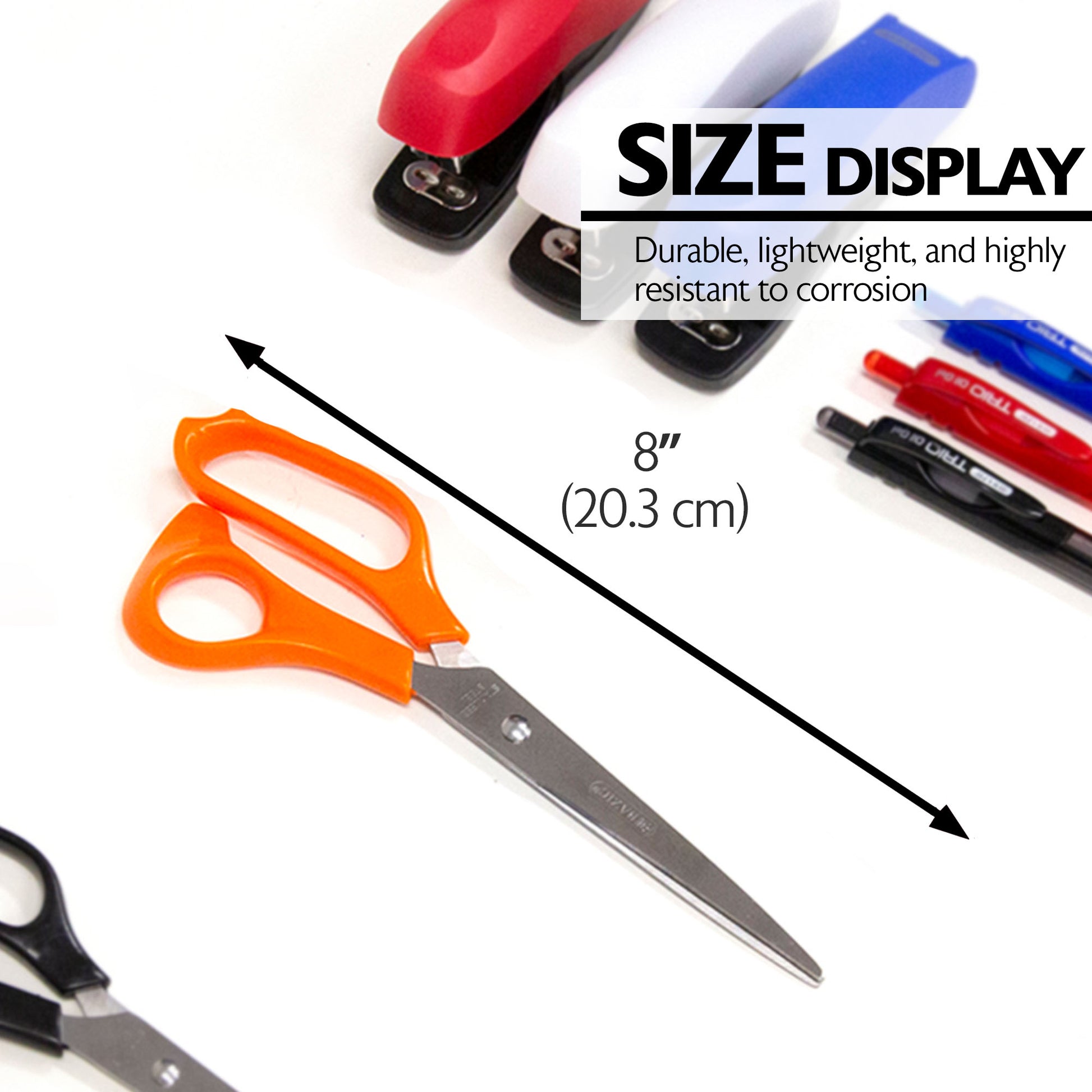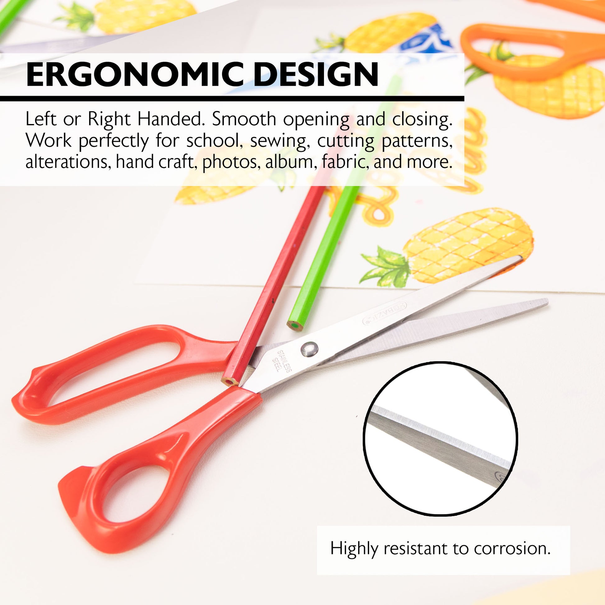 - DURABLE. Superior-quality scissors with molded handle to reduce finger fatigue. Made of lightweight stainless steel blade. Highly resistant to corrosion. Item measures: 8.25" x 2.75"